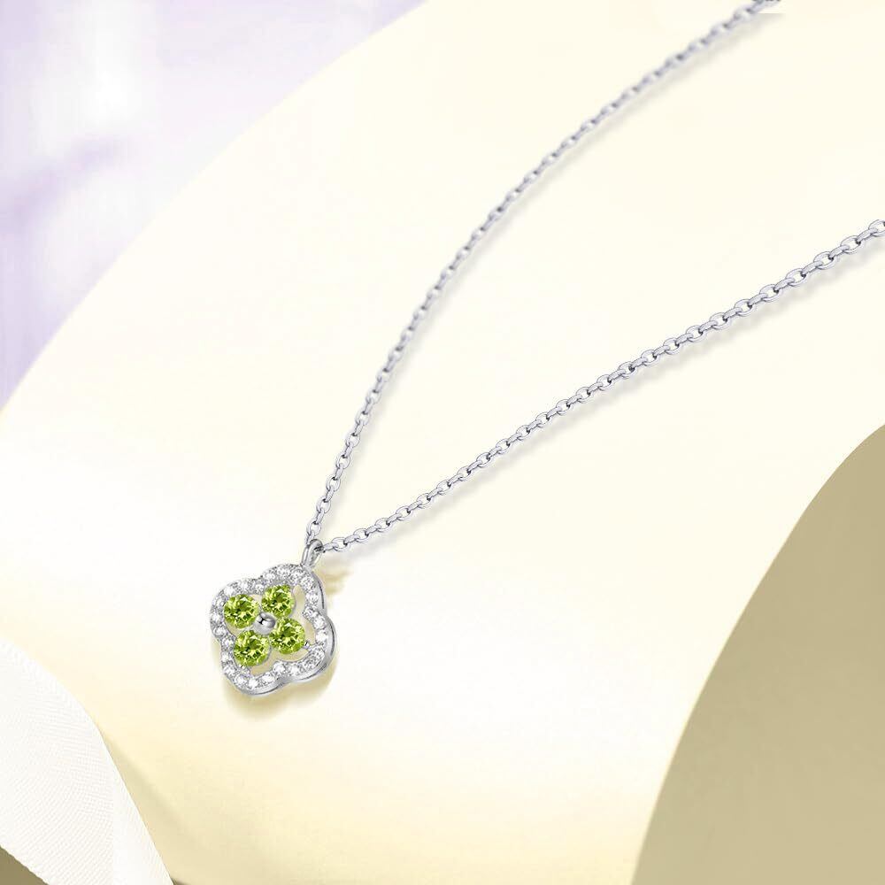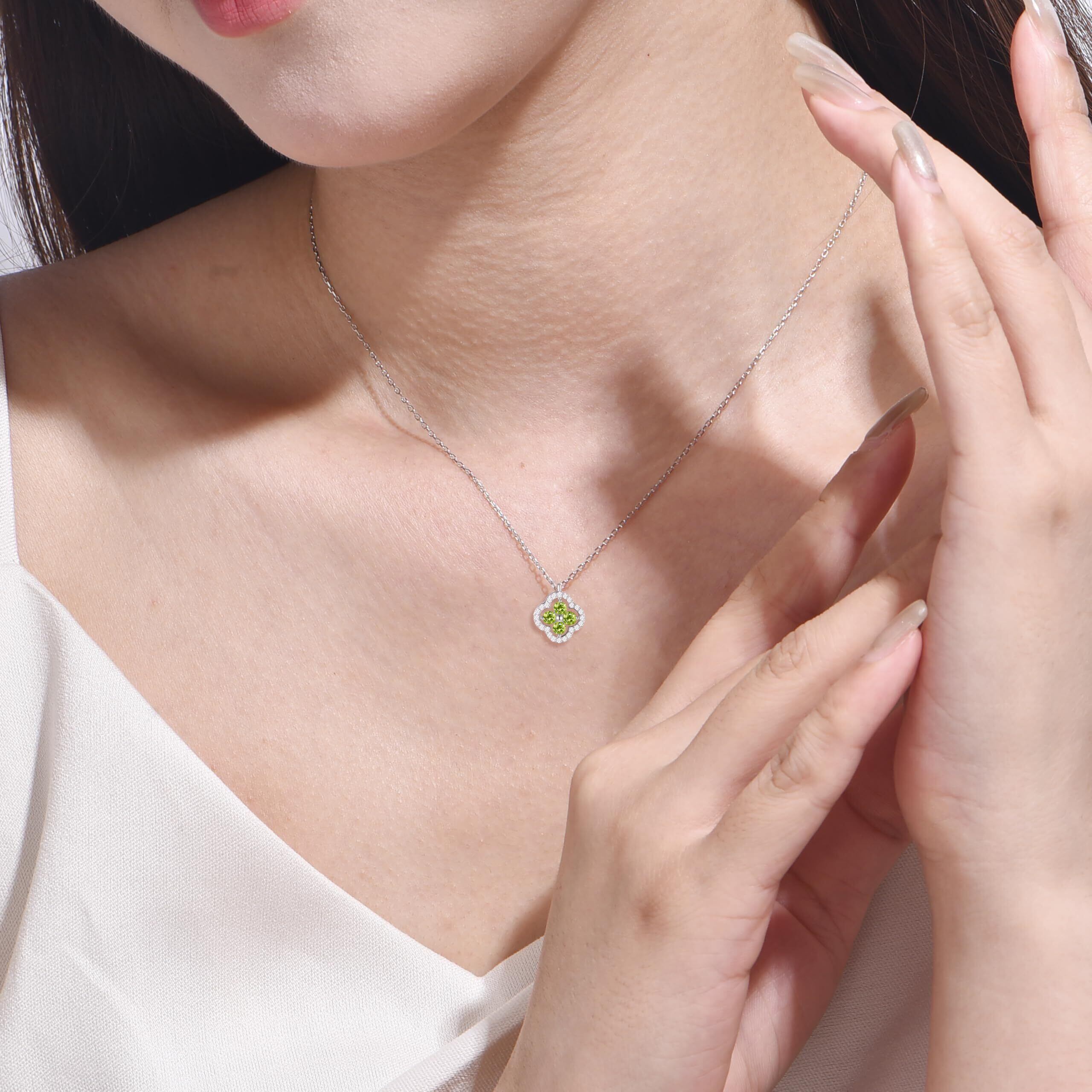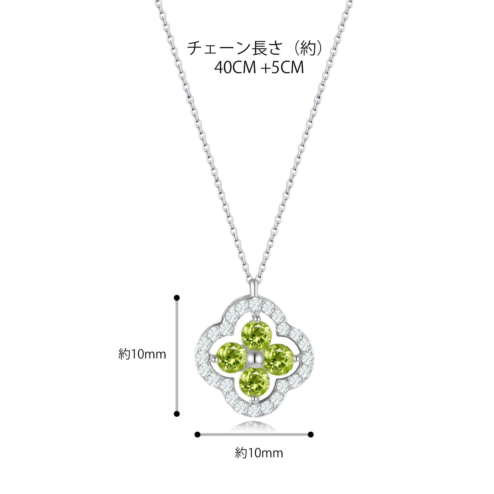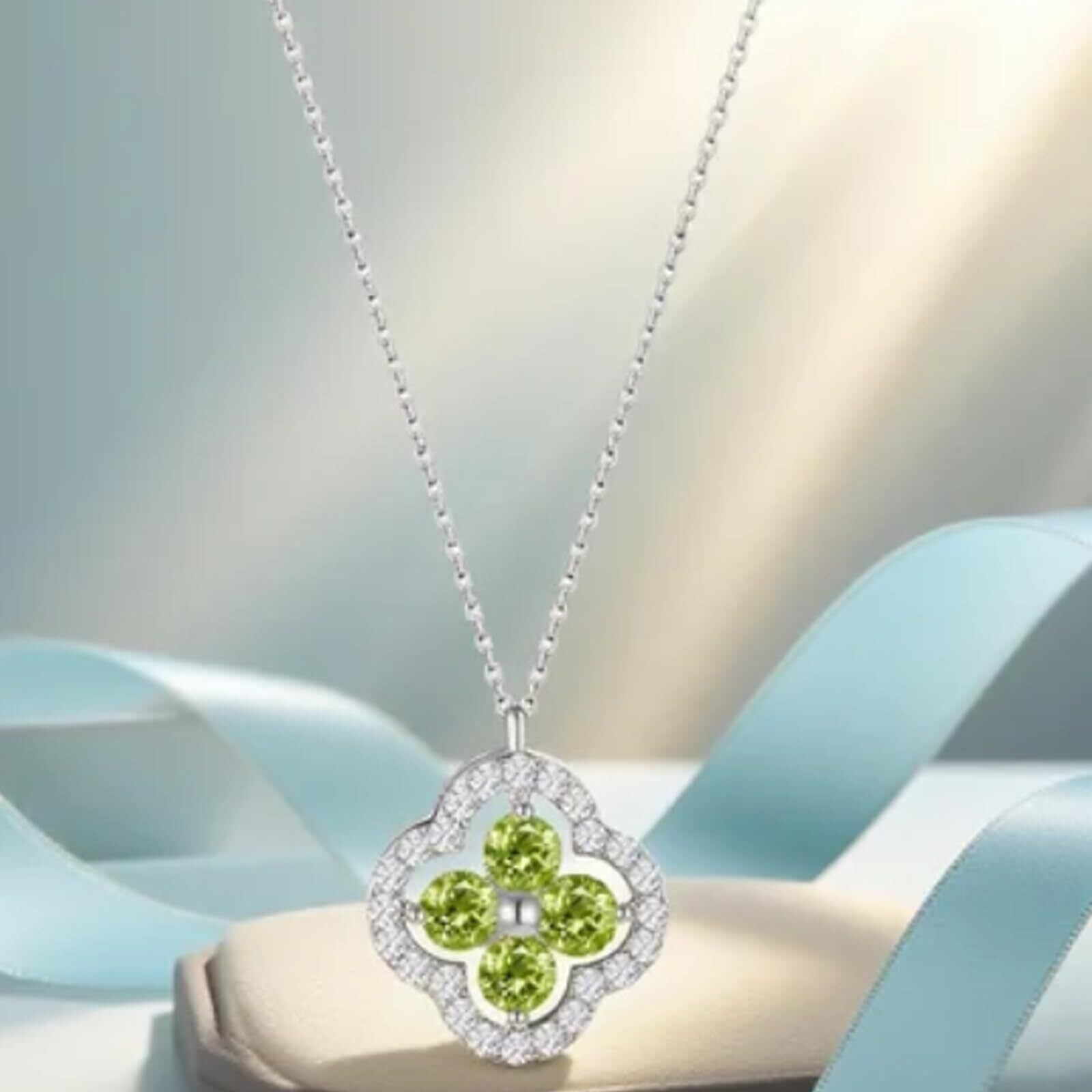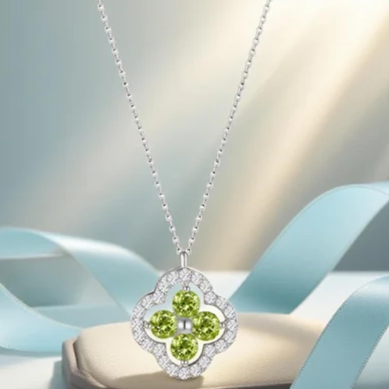 幸運のペンダント:四つ葉のクローバーの形にセッティングされたペリドットが、ポジティブなエネルギーを象徴。この誕生石ペンダントを身に着けるたび、未来への希望が心に芽生えるような輝きを放ちます