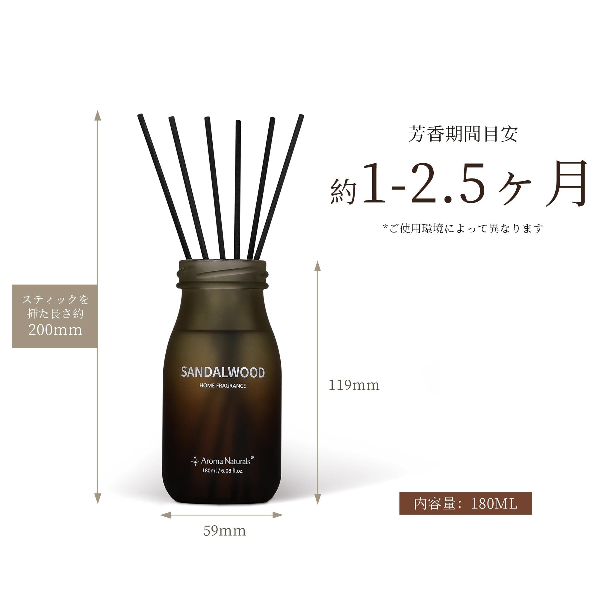 『香り持続時間』約1-2.5ヶ月(芳香期間は、スティックの本数、気候、温度や湿度、部屋の広さや置き場所によって異なります。)