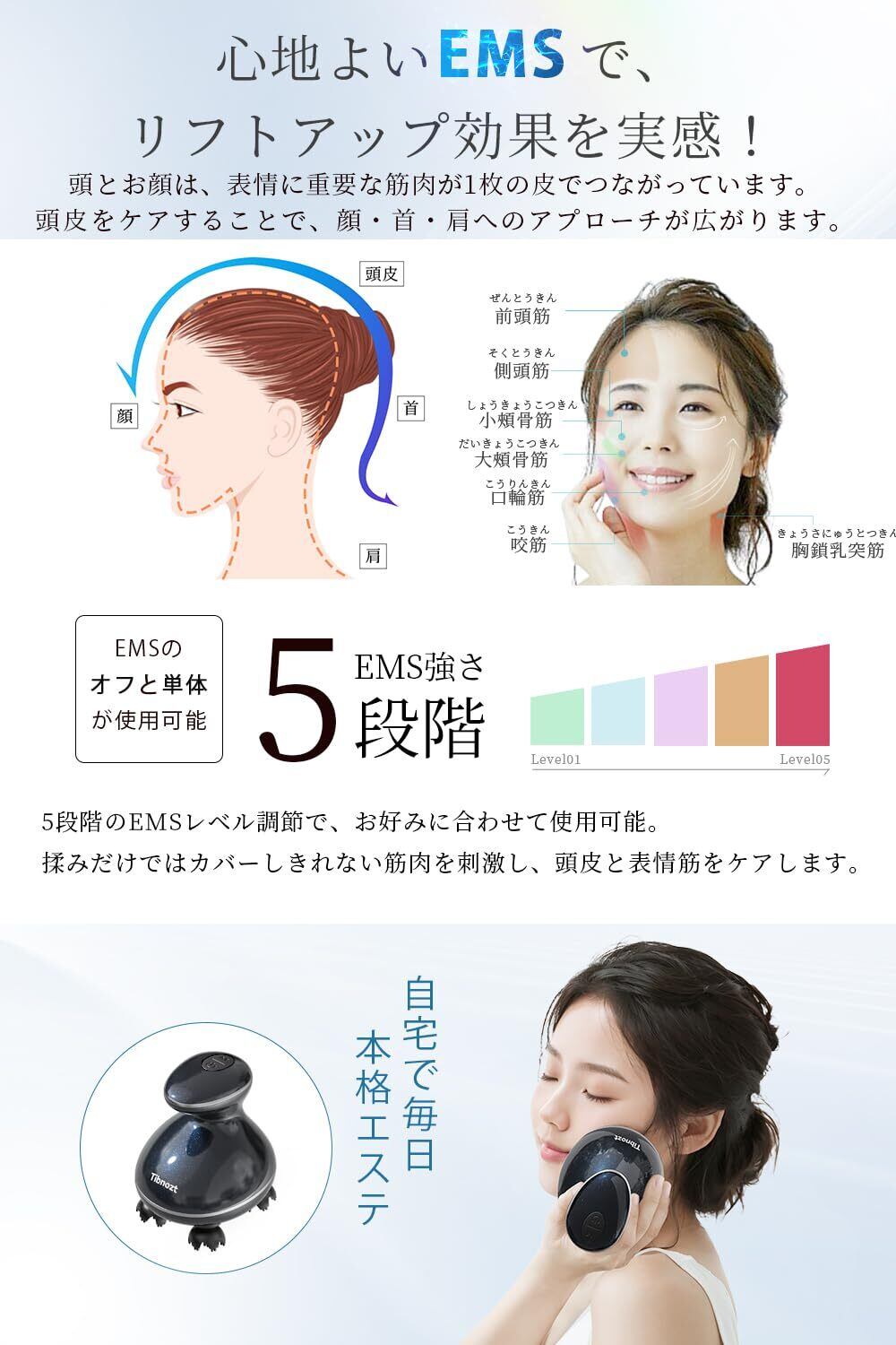 ️【頭皮の硬さをEMSで改善!グレードアップ効果を実感しよう~】5段階のEMSレベル調節で、お好みに合わせて使用可能。揉みだけではカバーしきれない筋肉を刺激し、頭皮と表情筋をケアします。※EMSのオフと単体が使用可能。※EMSをご使用の際は、水や化粧水で使用部位を湿らせてからお使いください。EMSを初めて使用する時や慣れるまでは、レベル1からご使用ください。
