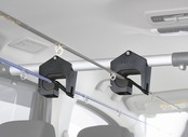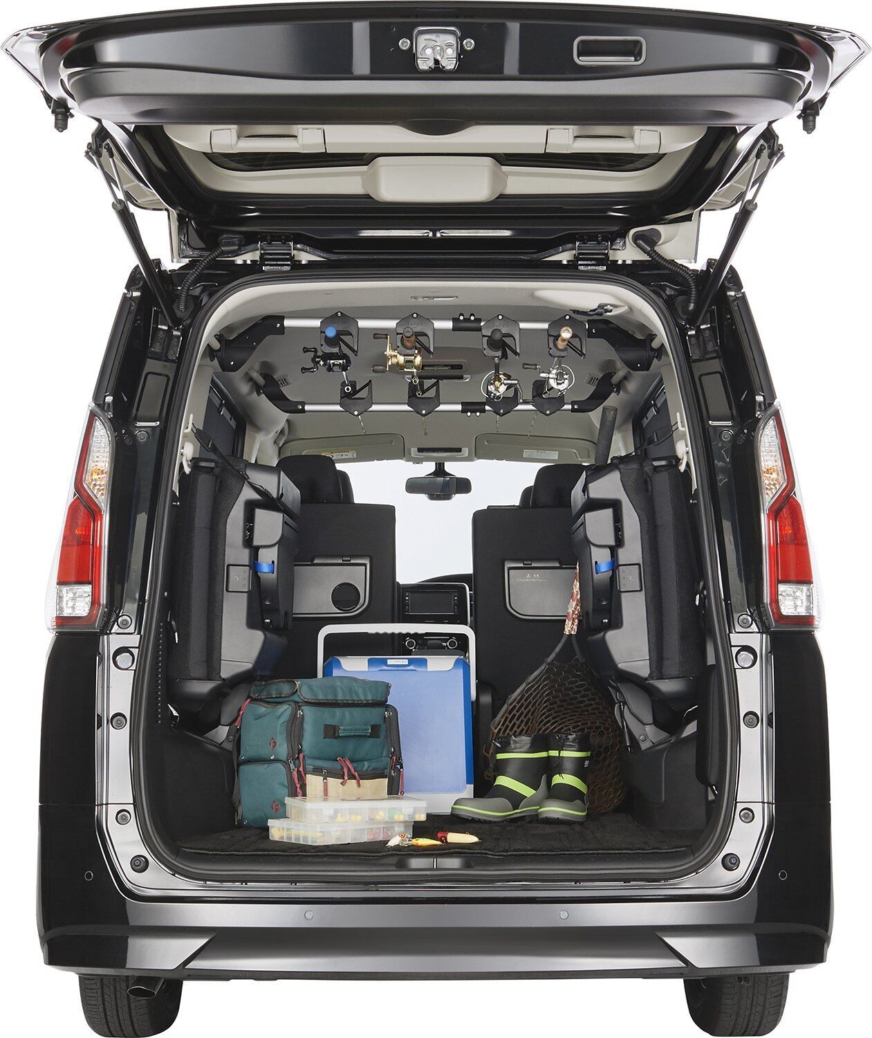 車両の頭上スペースに釣竿を固定し、車室内にスッキリ確実に収納。