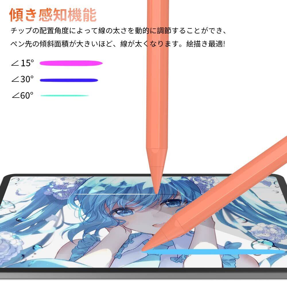 「傾きを感知機能対応&操作便利」JAMJAKE iPad用タッチペンは、傾きを感知できるので、チップの配置角度によって線の太さを動的に調節することができ、絵描き最適! また、bluetoothで接続しなくても利用できる。面倒な設定は不要で、タッチペンの上部を軽くタップして電源をオン/オフにして、非常に簡単です。(ご注意:傾き感知機能対応ソフト:SketchBook、Procreate、Paper、Noteshelf、Artset )