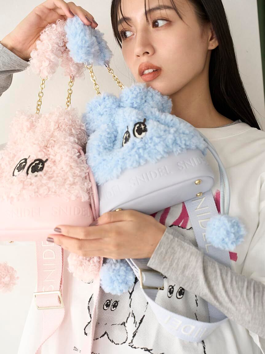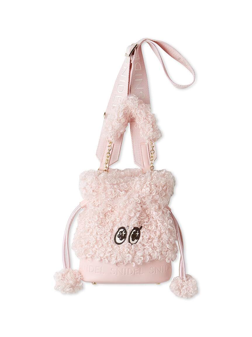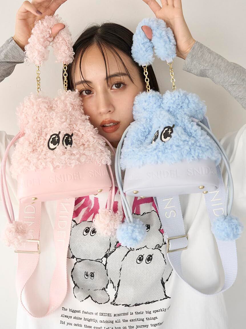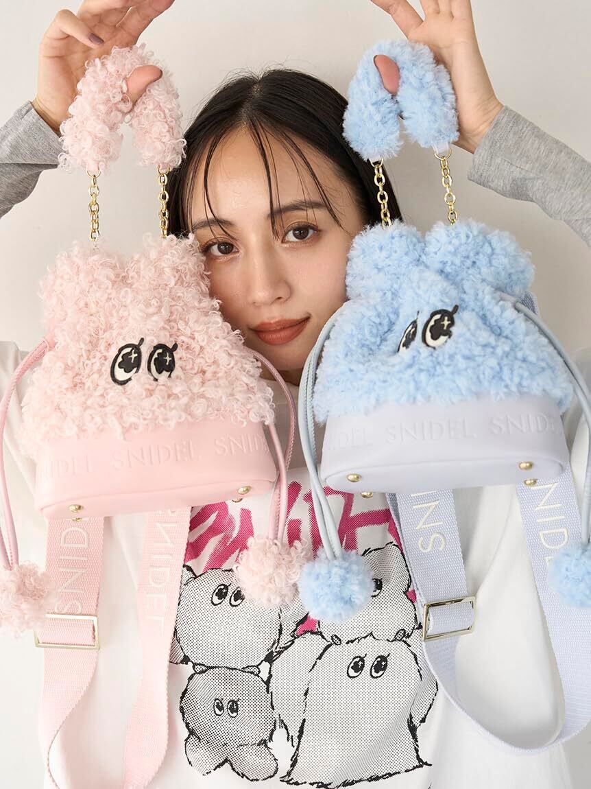 SNIDELオリジナルキャラクター「SNaMON」の可愛いEYEのパッチワークがポイントのエコファー巾着バッグが到着。ふわふわと触り心地の良いフェイクレザーと艶感のあるエナメル素材のEYEとのコンビが、華やかで愛らしいアイテムです。底部分のフェイクレザーにはSNIDELロゴが型押しされ、リッチな仕上がりに。選ぶカラーによってファーの種類が異なるプレイフルなデザインが魅力です。ファーをあしらったキュートなチェーンハンドルの他にも、人気の高いSNIDELロゴ刺繍入りのウェビングストラップが付いているので、肩掛けにも斜めがけにもできる3WAYです。チェーンハンドルもストラップも取り外しが可能。コンパクトですが、マチがあり、底鋲も付いていて自立するのも優秀です。ホワイト、イエロー、ピンク、ブルーの4色展開にてご用意しました。ホワイトは毛足のやや長いエコファーを使用。イエローは短毛のエコファーを使用。ピンクとブルーにはプードル のようにカールした毛足のエコファーを使用。こだわりがたくさん詰め込まれたイットバッグです。