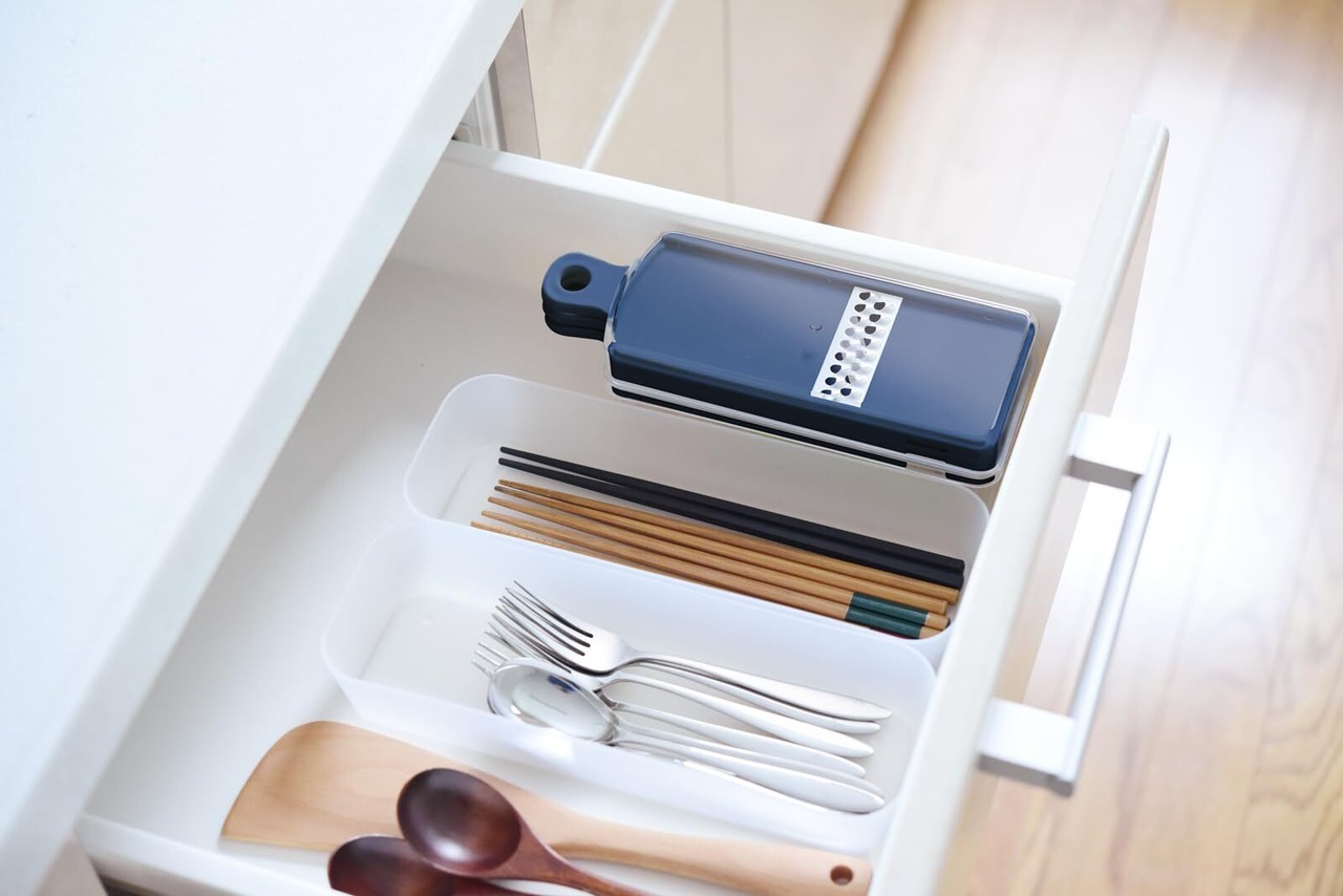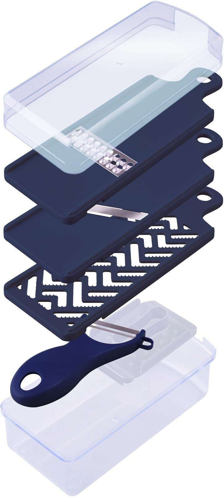 千切り、平切り、おろしのプレート3枚とピーラー、安全ホルダー、ケースとカバーが付いたお買い得7点セット。引出にコンパクトに収まるサイズ感で場所をとりません。