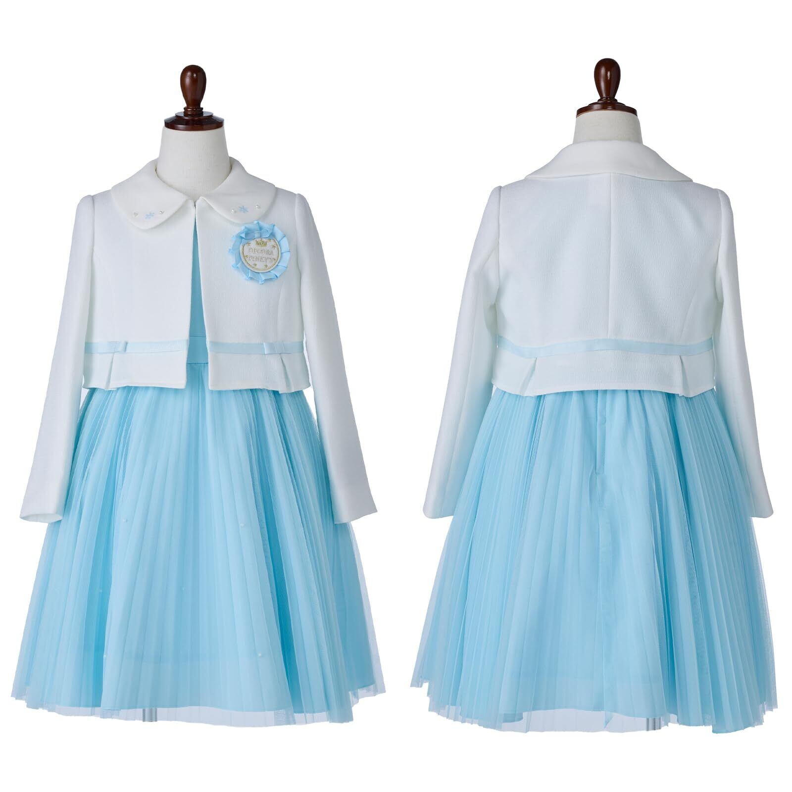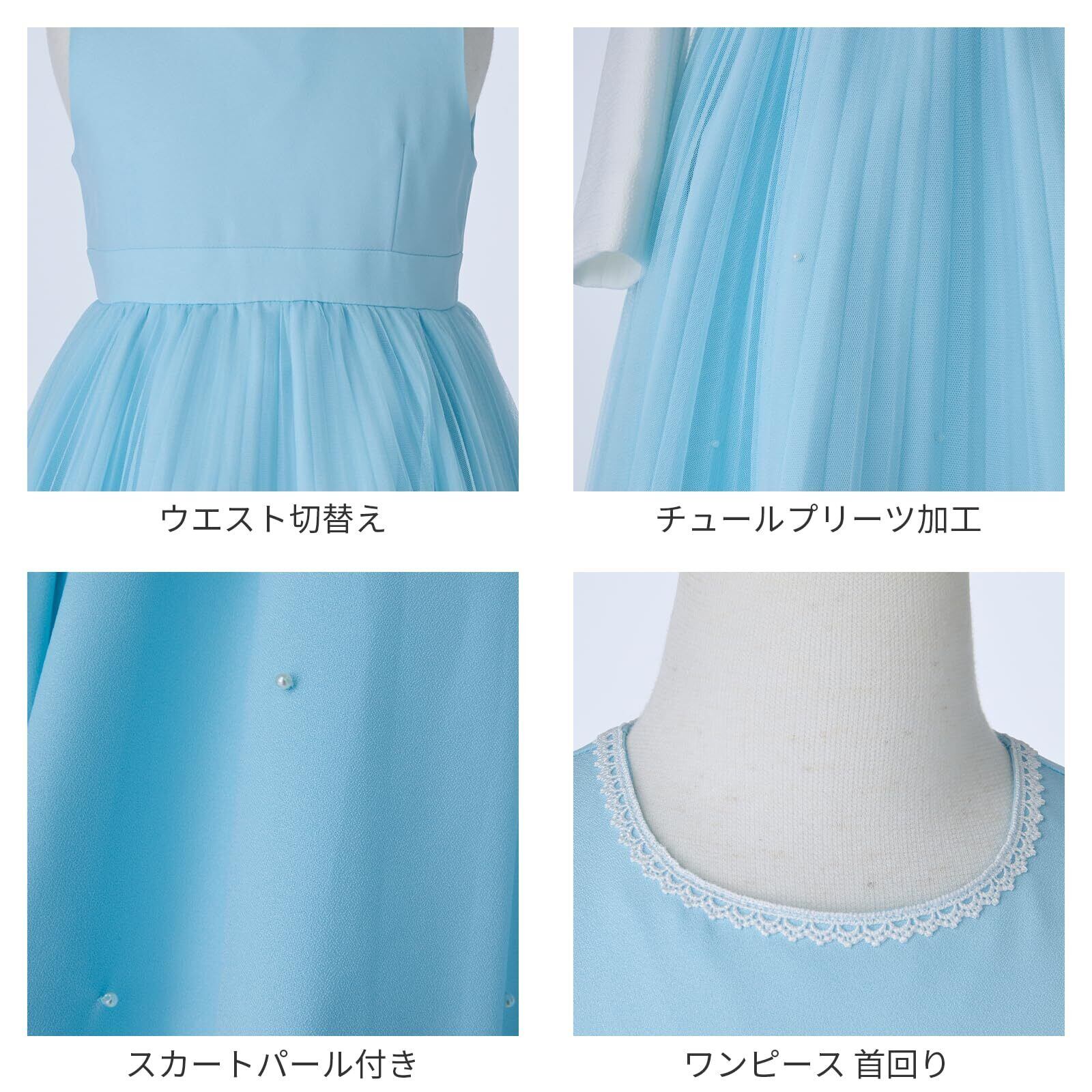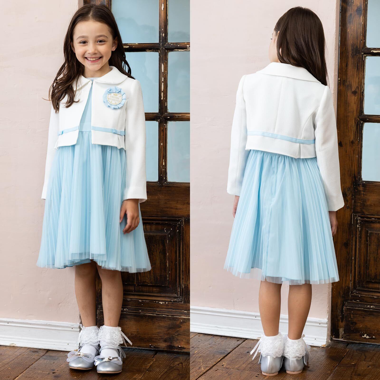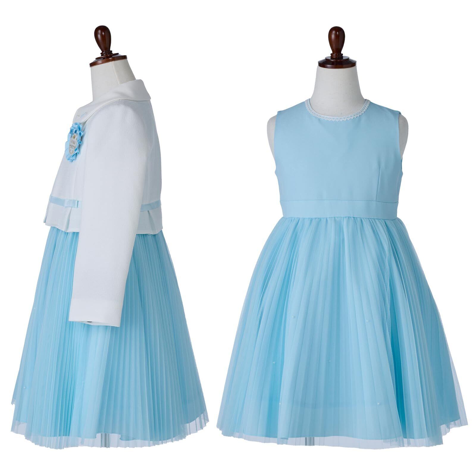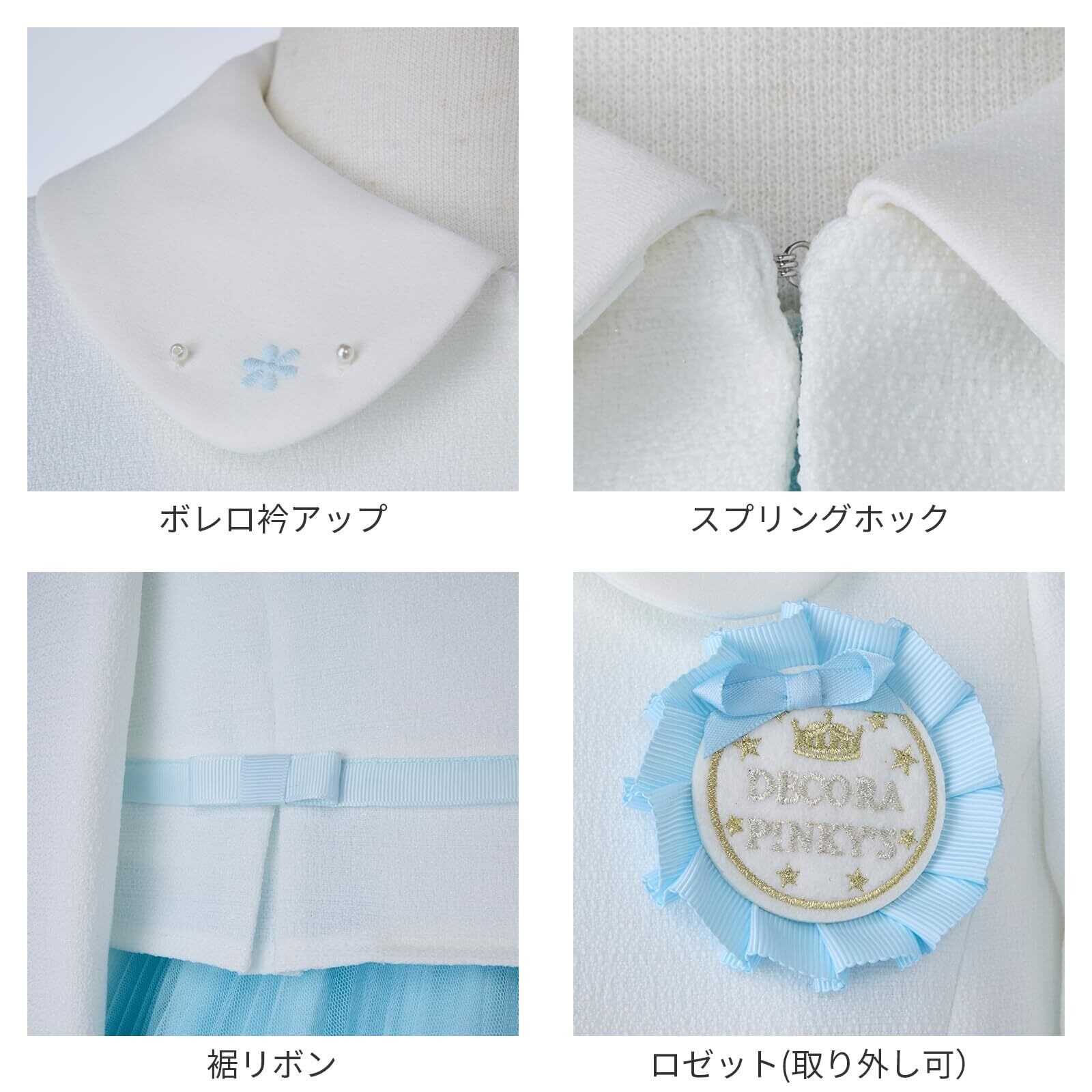 ボレロ、ワンピース、ロゼットの3点セットアンサンブル。ワンピースはチュールとのレイヤードで柔らかさとふんわりとした可愛らしさを演出しています。ボレロにはグログランテープの切り替えとリボンアクセント。大きめの襟には可愛らしい小花刺繍とパール付き。ロゼットは取り外し可能です。ノースリーブワンピースは1枚着でも上品な仕上がり。