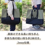 特徴:フロントにベルトループ付き。持ち方2way、肩掛けできる長い持ち手と手持ち用の短い持ち手2本付き。重いものを運びやすい補助取っ手付き。両側面のサイドバックルで荷崩れを防止できます。