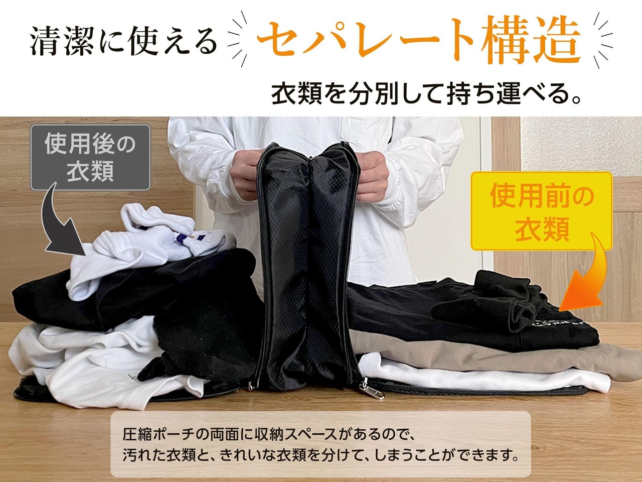 ■【セパレート構造/分別収納】ポーチの両面に収納スペースがあるので、汚れた衣類ときれいな衣類を分けて、収納することができます。