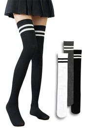 【商品詳細】(サイズ)フリー ※かかとはついておりません (素材構成)綿48% ナイロン40% ポリウレタン12% (柄と長さ)<三足組A> ダブルライン ミディアム 40cmひざ下 <三足組B> ダブルライン ロング 55cmひざ上 <三足組C> 無地 ミディアム 40cmひざ下 <三足組D>無地 ロング 55cmひざ上 の4つ
