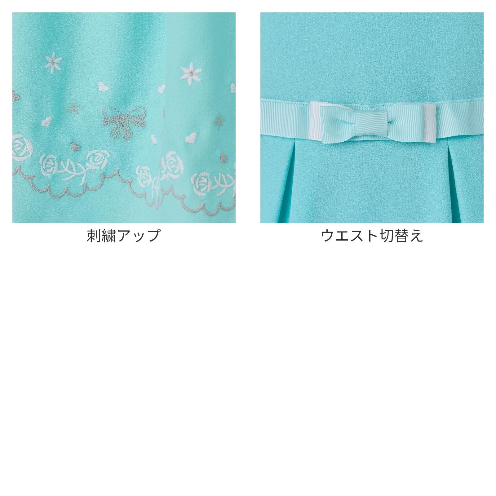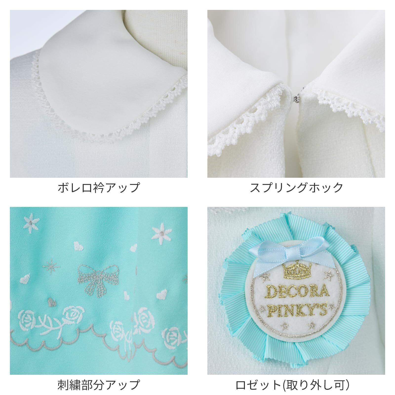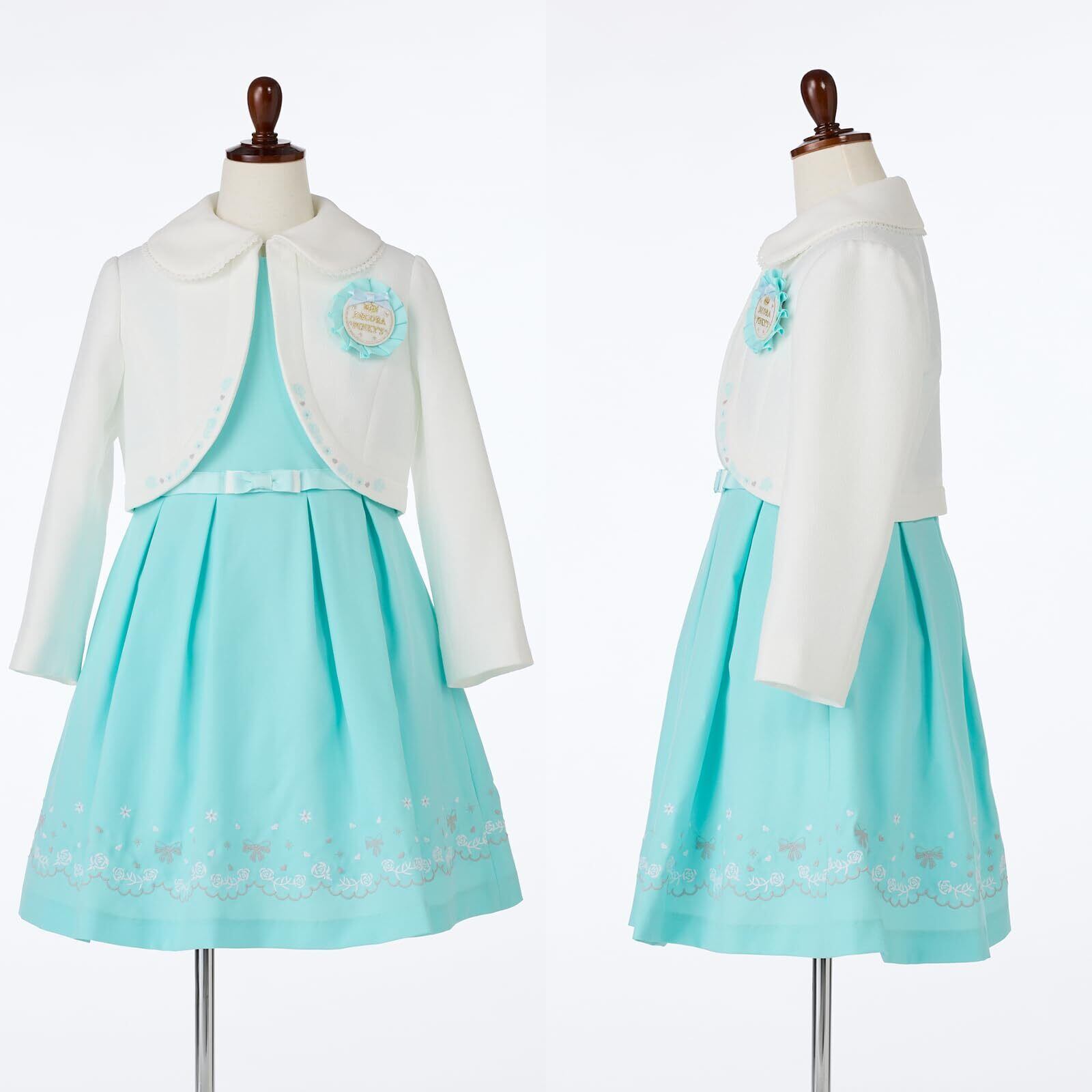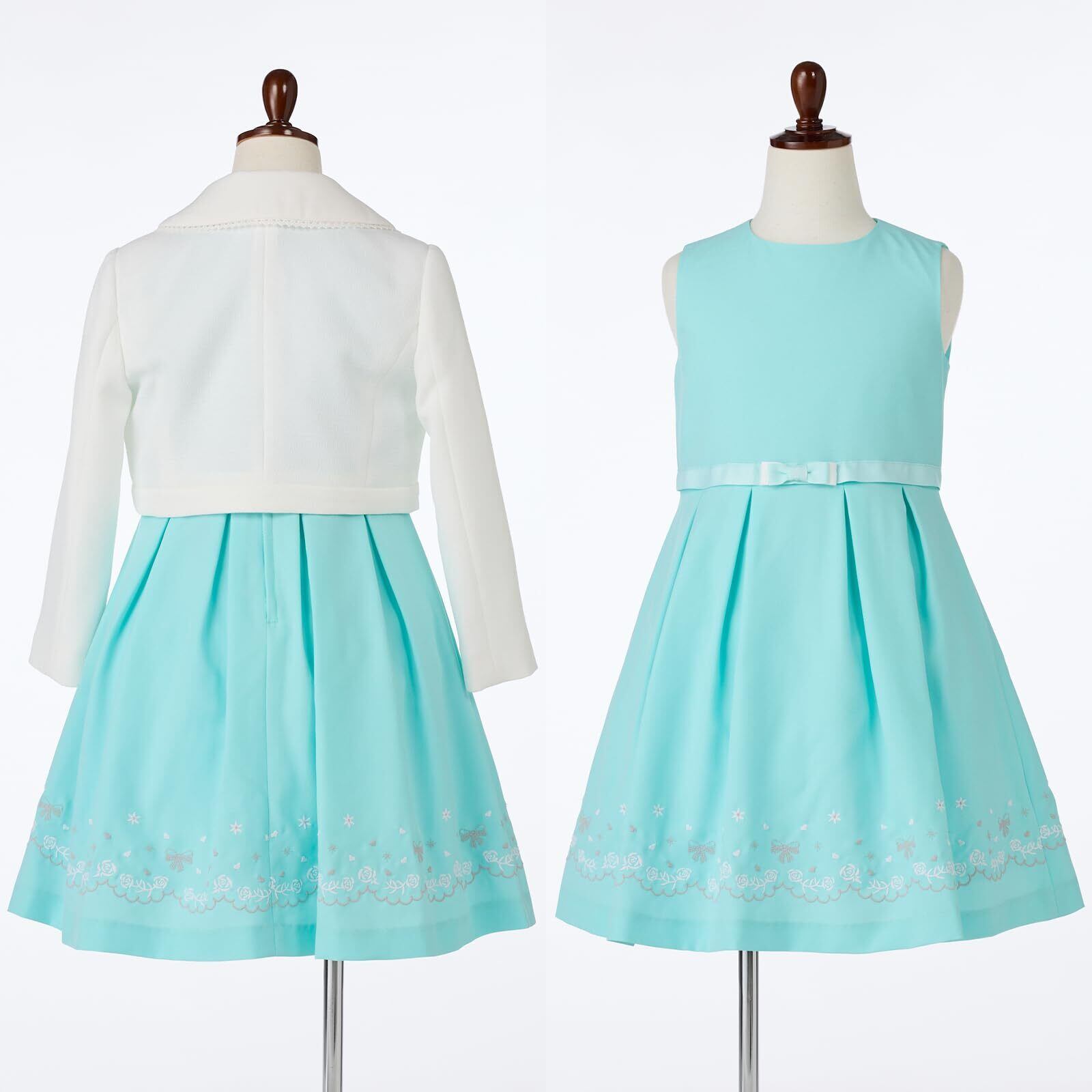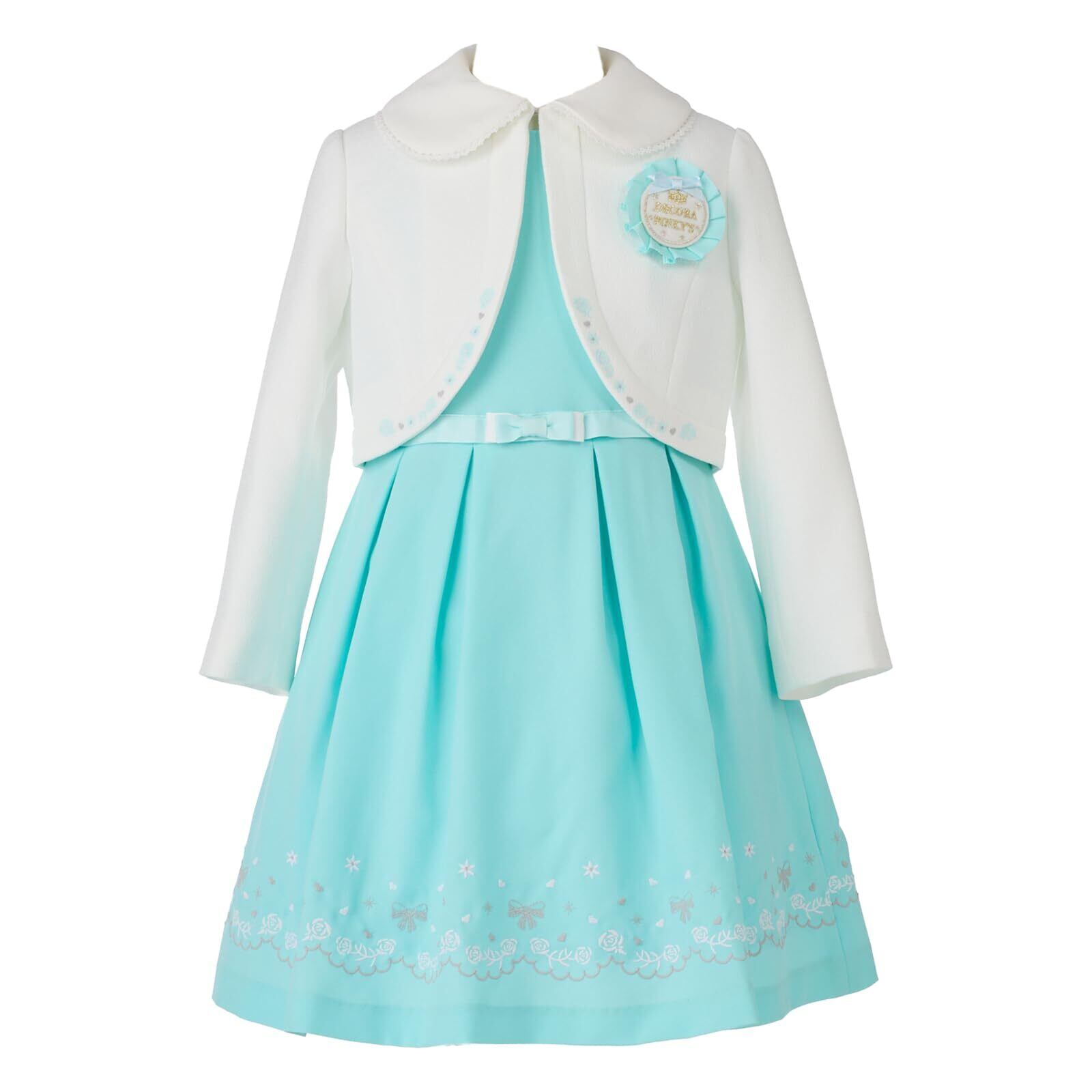 ボレロ、ワンピース、ロゼットの3点セットアンサンブル。裾に刺繍を施した上品なワンピースは1枚着でもオシャレに着用いただけます。ボレロにも刺繍を施し贅沢な仕上がりがポイント。ウエスト切り替えのグログランリボンもアクセントに。大きめの襟には可愛らしいレース付き。ロゼットは取り外し可能です。