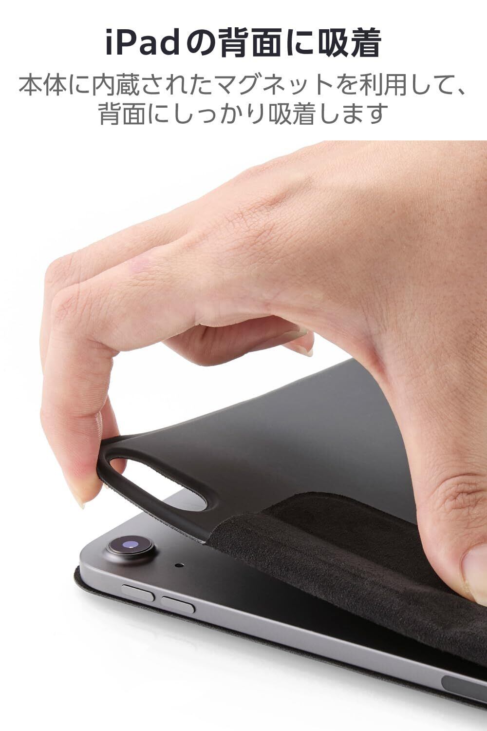 ■iPad本体に内蔵されたマグネットを利用して、iPadの背面にしっかり固定します。