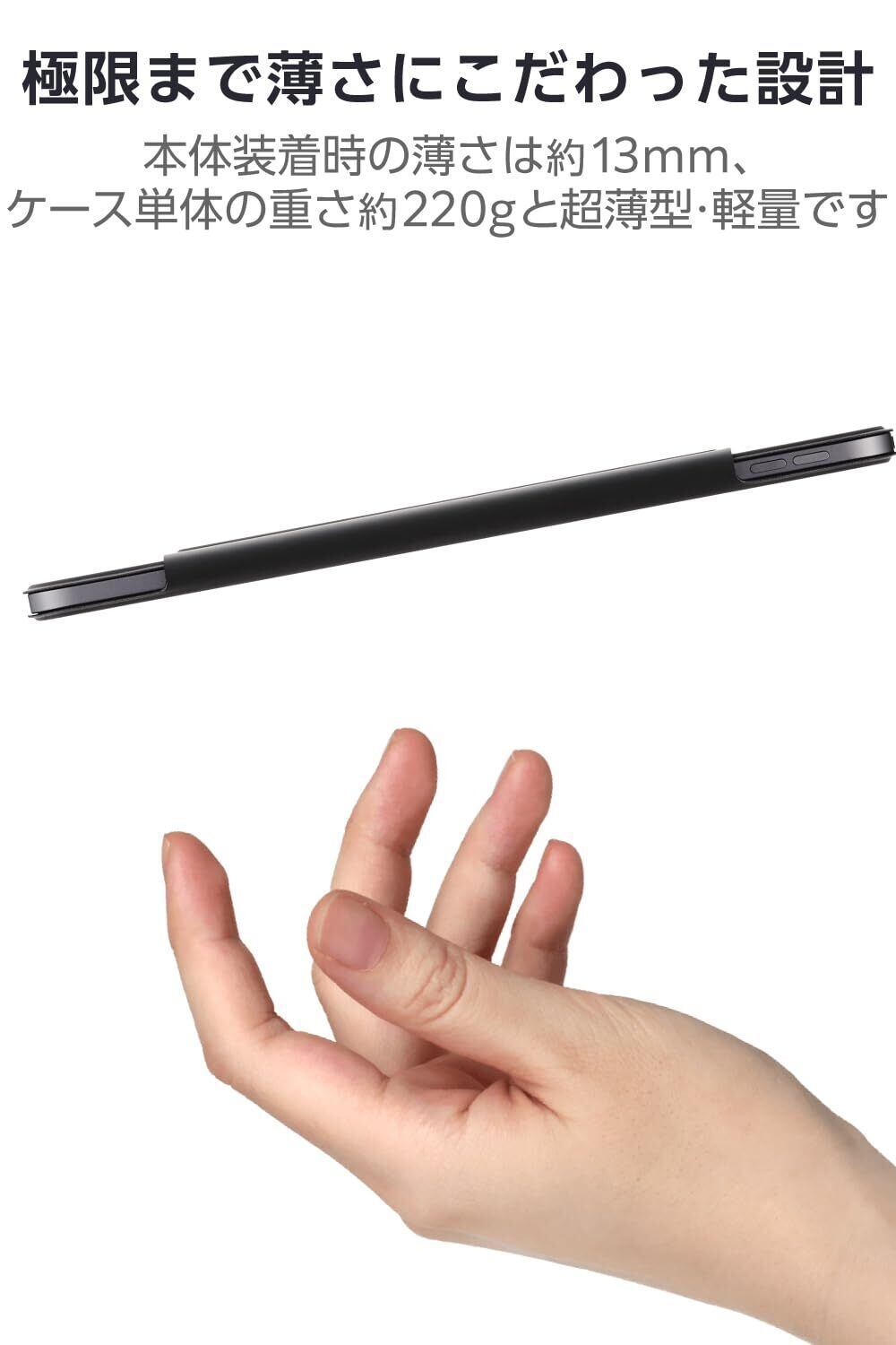 ■iPad本体装着時の薄さは約13mm、ケース単体の重さは約220gです。iPad本体のスリムなフォルムを損ねずにしっかり保護します。