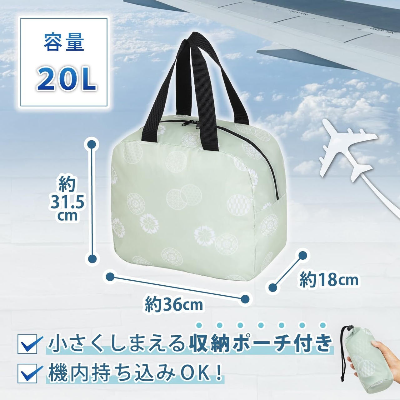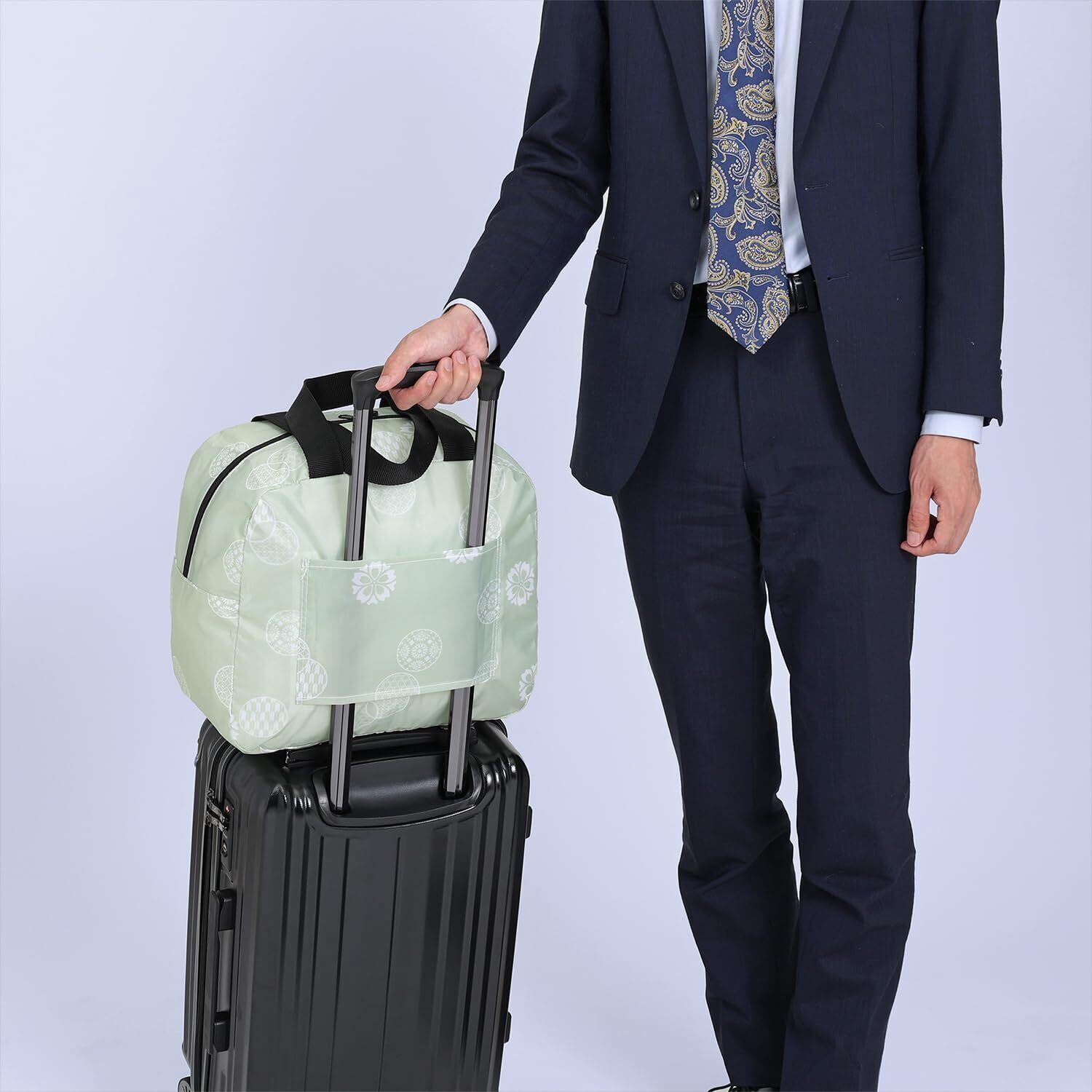 アストロ キャリーオンバッグ ライトグリーン 和モダン柄 容量20L 撥水加工で水をはじく スーツケース キャリーケース バー通し穴付き ボストンバッグ トートバッグ 小さく折りたためる コンパクトになる エコバッグ サブバッグ ポリエステル製 収納袋付き 607-60