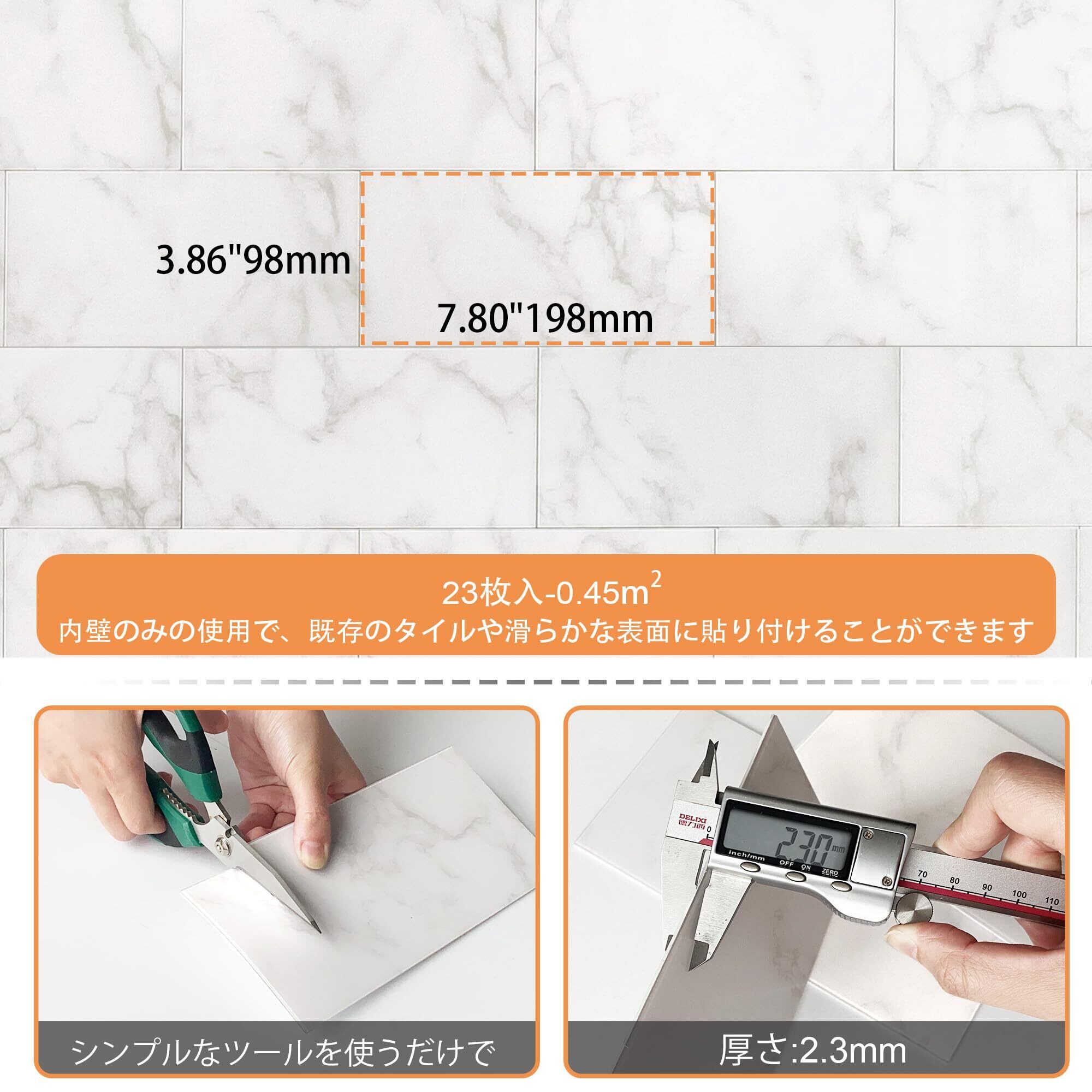 VAOVIタイル 壁 キッチン タイルシール 大理石調,大理石風 シート 耐熱 防水シートトイレ 玄関 洗面所98x198mm(23枚,カララホワイト)