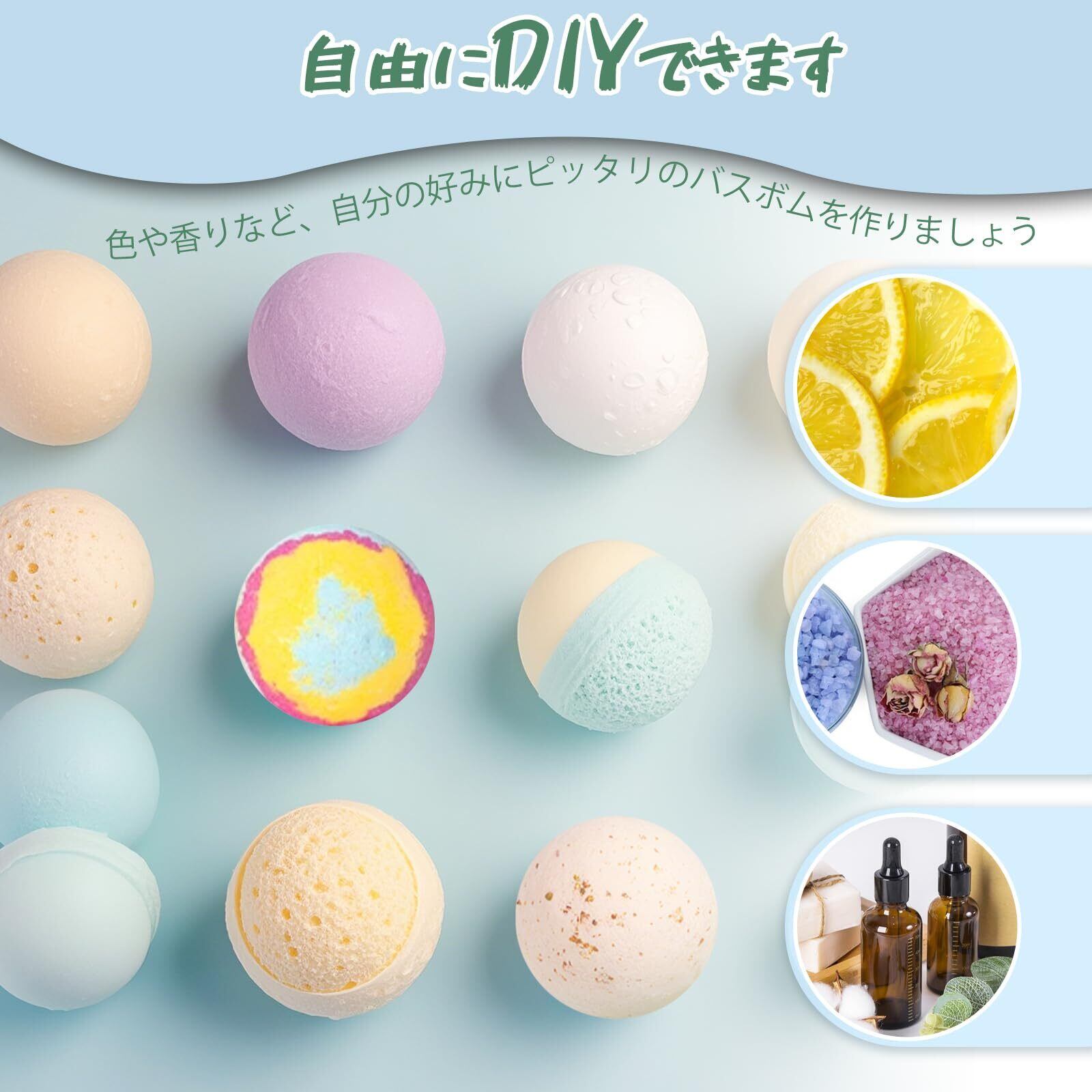 【手作りの楽しさ】材料を自由にアレンジし、自分の好みにピッタリのバスボムを作ることができます。いろいろ試しながら手作りの楽しさを楽しみましょう。