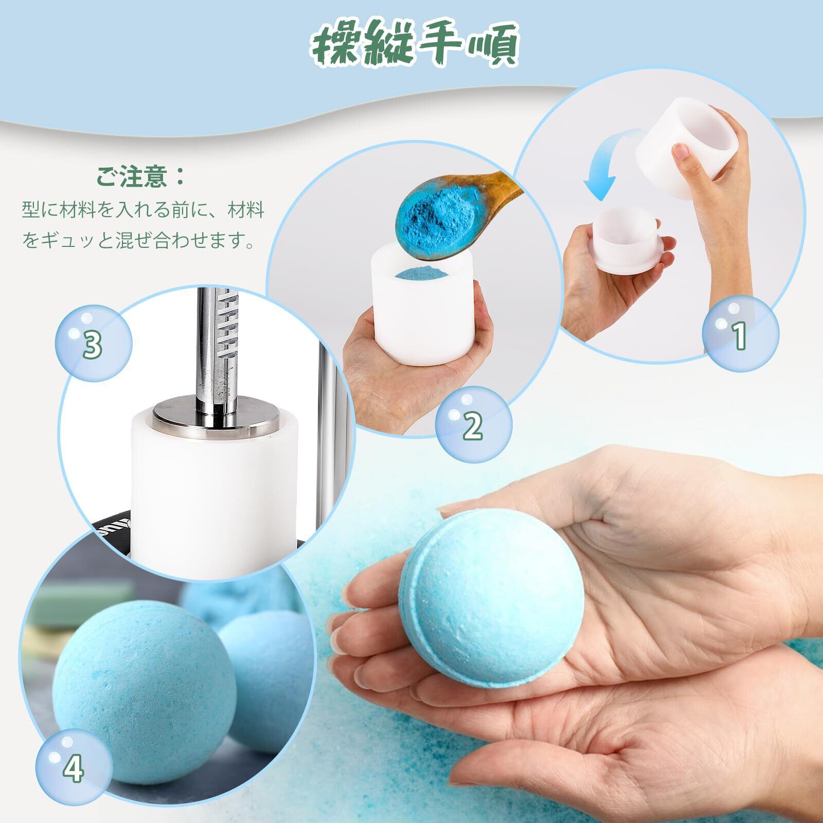 【初心者でも楽に】事前に混ぜた材料を型に入れ、バスボムメーカーで押し込めば、バスボムが簡単に成形します。これにより、均一なサイズと密度のバスボムを作ることができます。