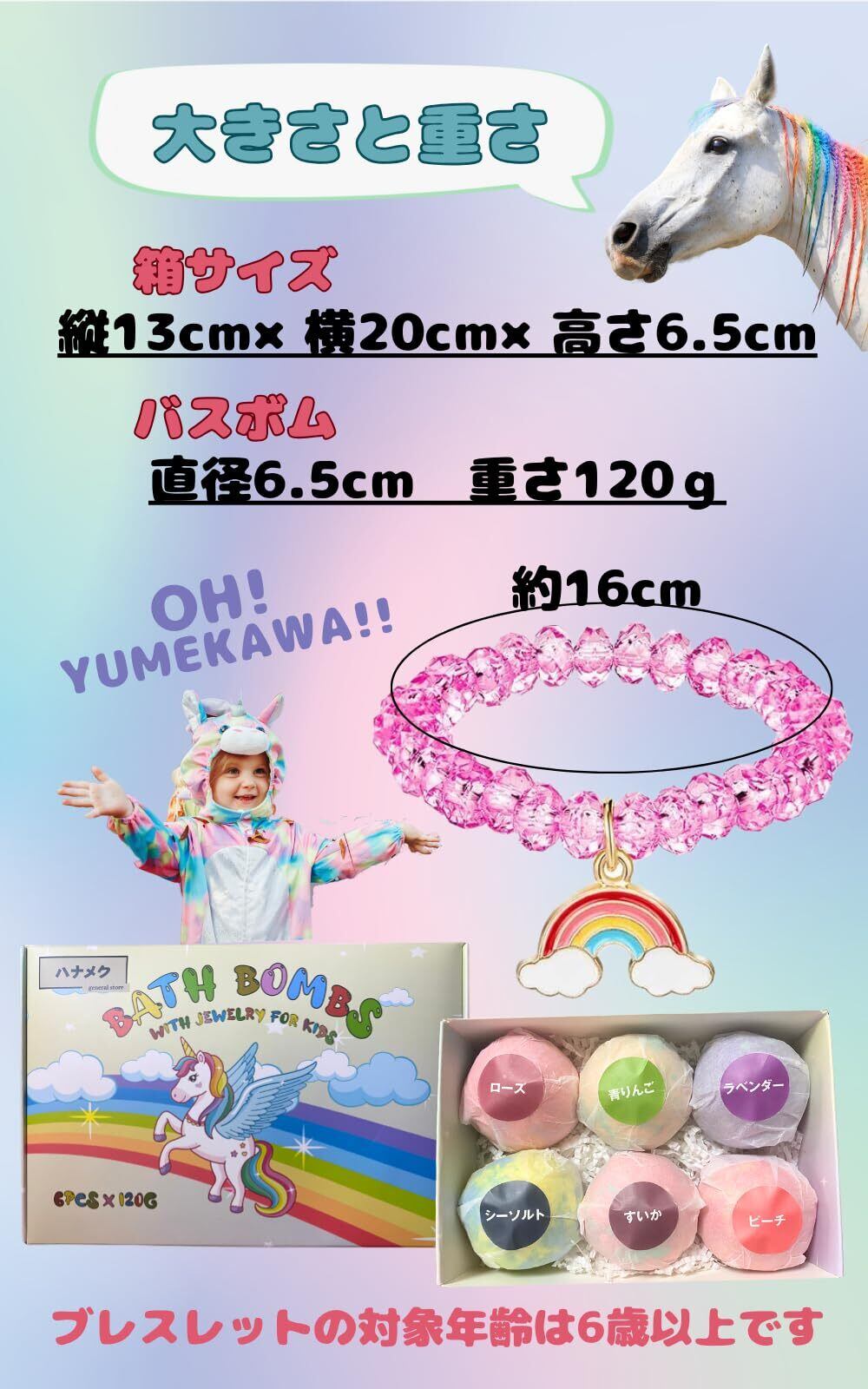 【サイズ】箱・・・縦13cm×横20cm×高さ6.5cm バスボム・・・直径6.5cm 重さ120g アクセサリー・・・直径約16cm ※お子様用ですので大人方はお付けにならないようお願いします。