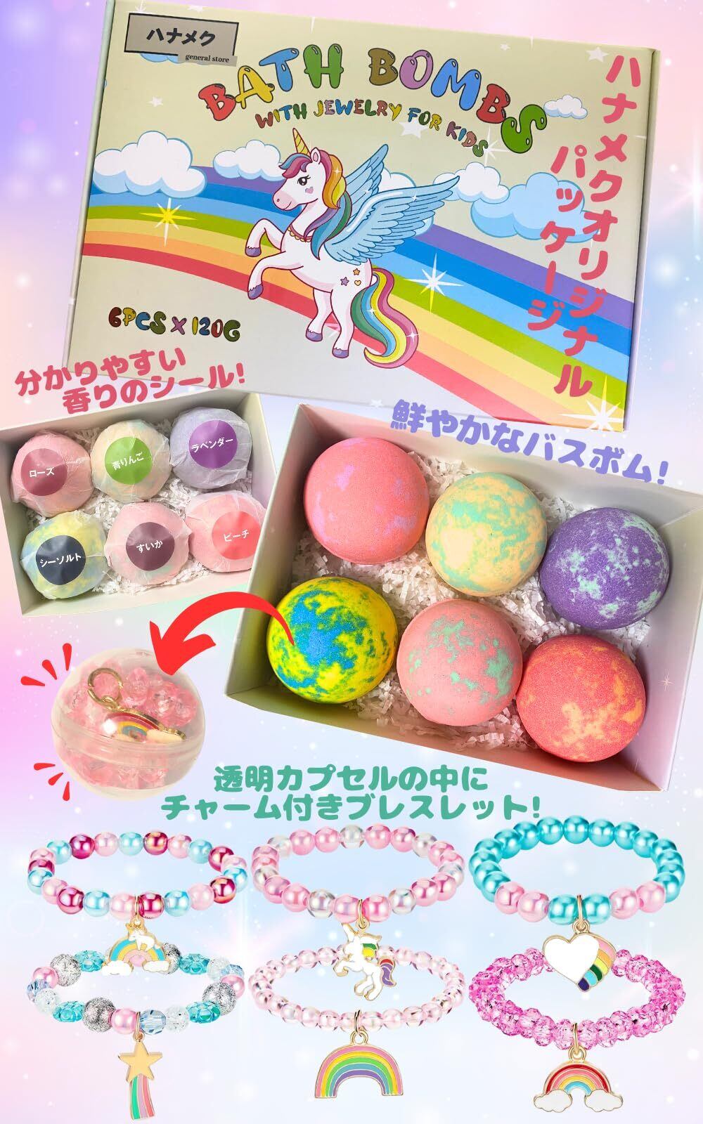 【おもちゃのアクセサリー入りバスボム6個セット】ゆめかわいいをイメージしたバスボムの中にそれぞれ違う種類のチャーム付きブレスレットがはいっています。フレーバーはラベンダー・シーソルト・ローズ・青りんご・すいか・ピーチの6種類!気分に合わせたフレーバーでわくわくどきどきのバスタイムをお楽しみください。お風呂嫌いのお子様も大喜びすること間違いなし!お誕生日、クリスマス、記念日などのプレゼントにも選んでいただけたらうれしいです。