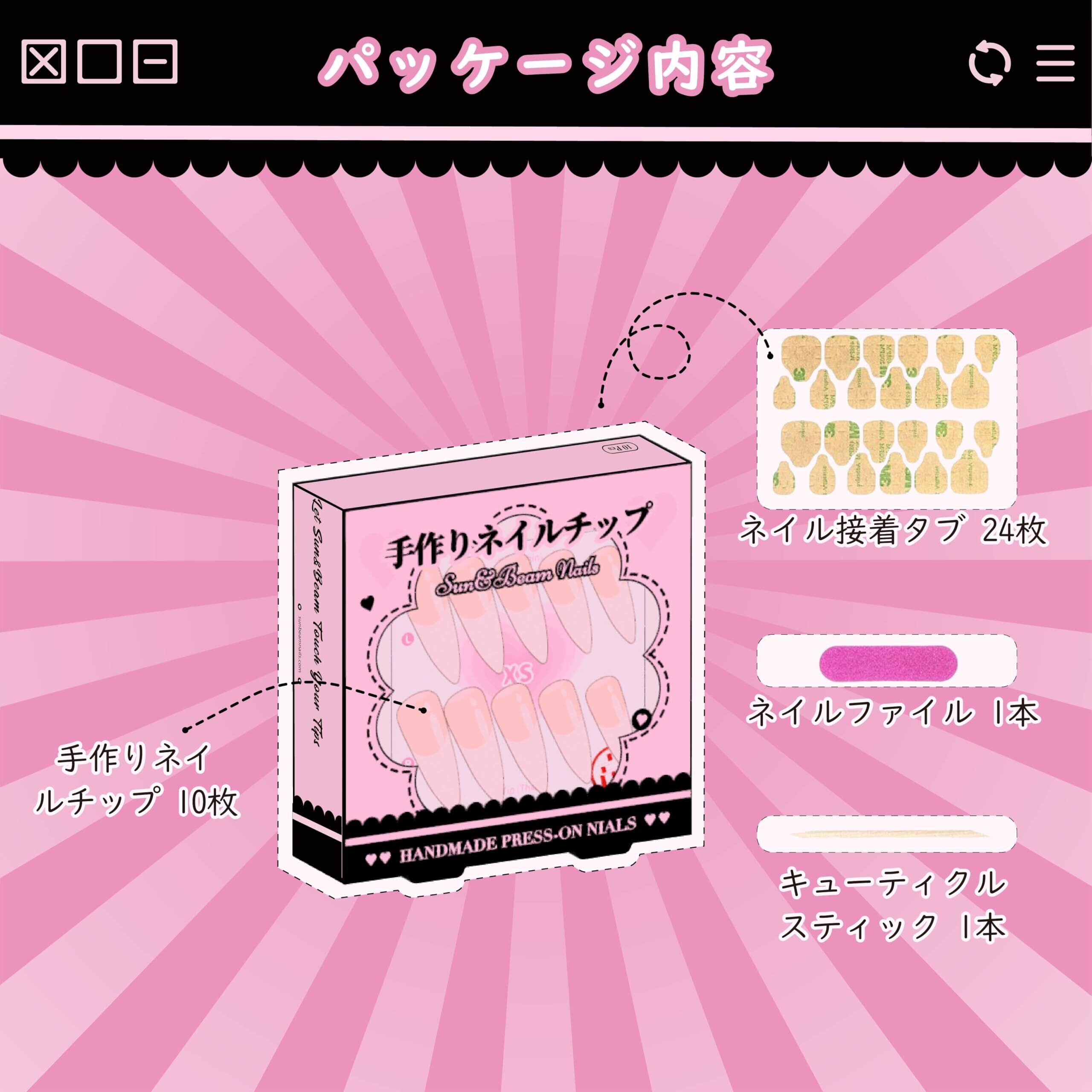 【内容】含まれているもの: 10枚のネイルチップ、24枚の爪用両面テープ、1つの爪やすり、1つの木製キューティクルスティック、1つの収納ボックス。※最高の結果と再利用性のためには、Sun&Beam Nailsが販売するジェリーグルーの使用を推奨します。