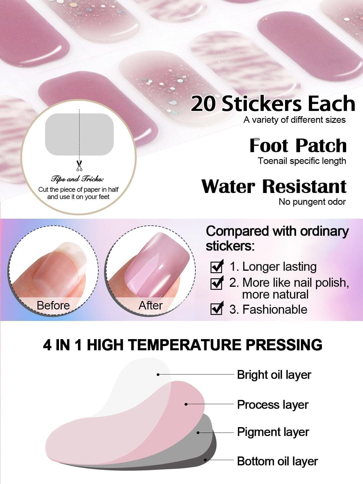 【使いやすい】当社のUVネイルジェルステッカーは本物の液体ジェルで作られており、事前に半硬化しています。 半硬化ジェルネイルラップステッカーは、貼り付け、やすりで削るのが簡単で、UVライトで硬化します。 わずか数分でサロン品質のネイルアートが完成します。 木の棒や指で簡単に剥がすことができます。