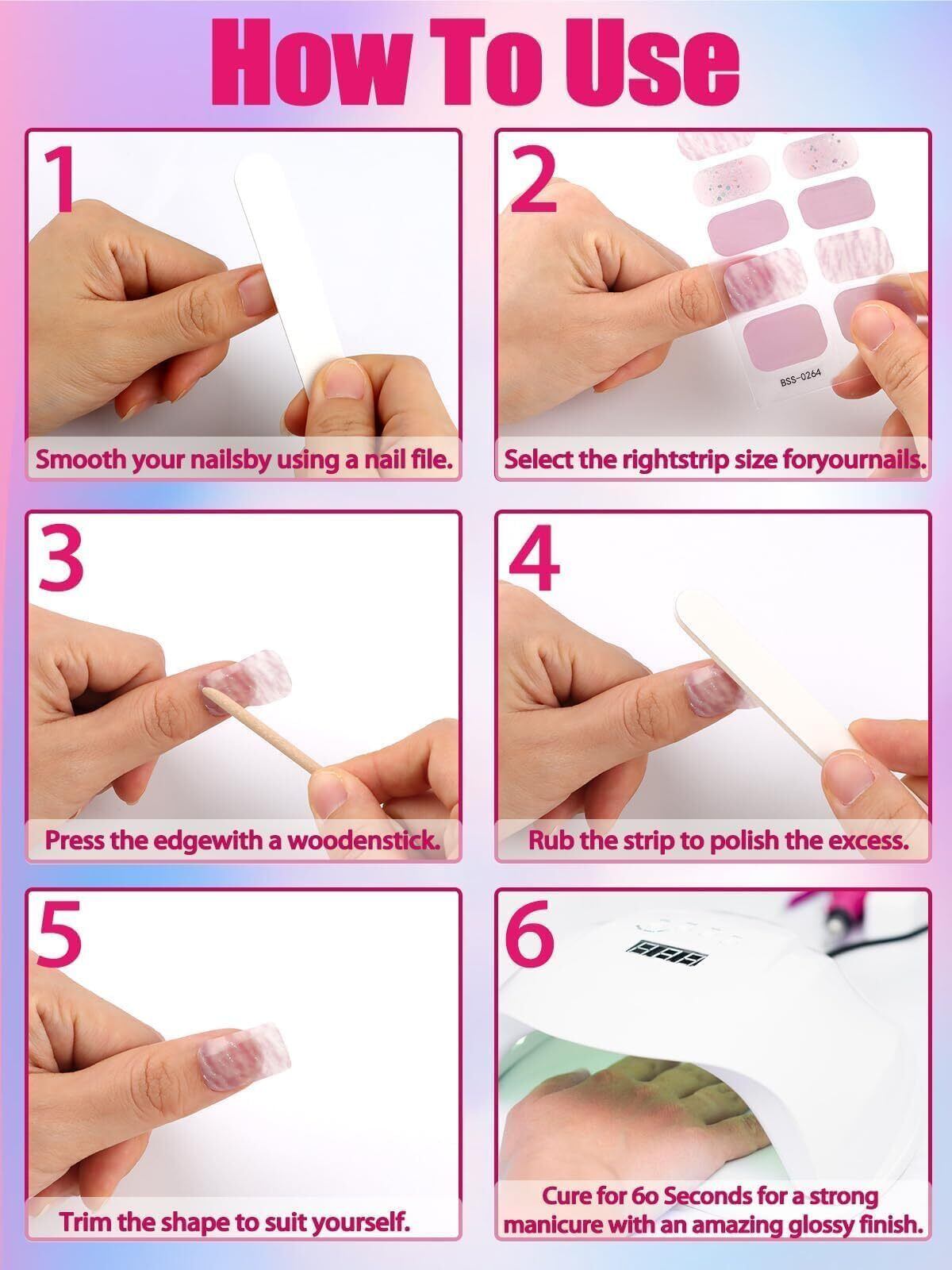 【暖かいヒント】ネイルジェルステッカーはUV/LEDライトで60秒間硬化する必要があります。 ジェルネイルが完全に硬化していない場合、硬化時間を延長する場合がございます。 残ったフルネイルラップは必ず黒いバッグに戻し、乾燥を防ぐためにシールストリップを使用して開口部を密閉してください。