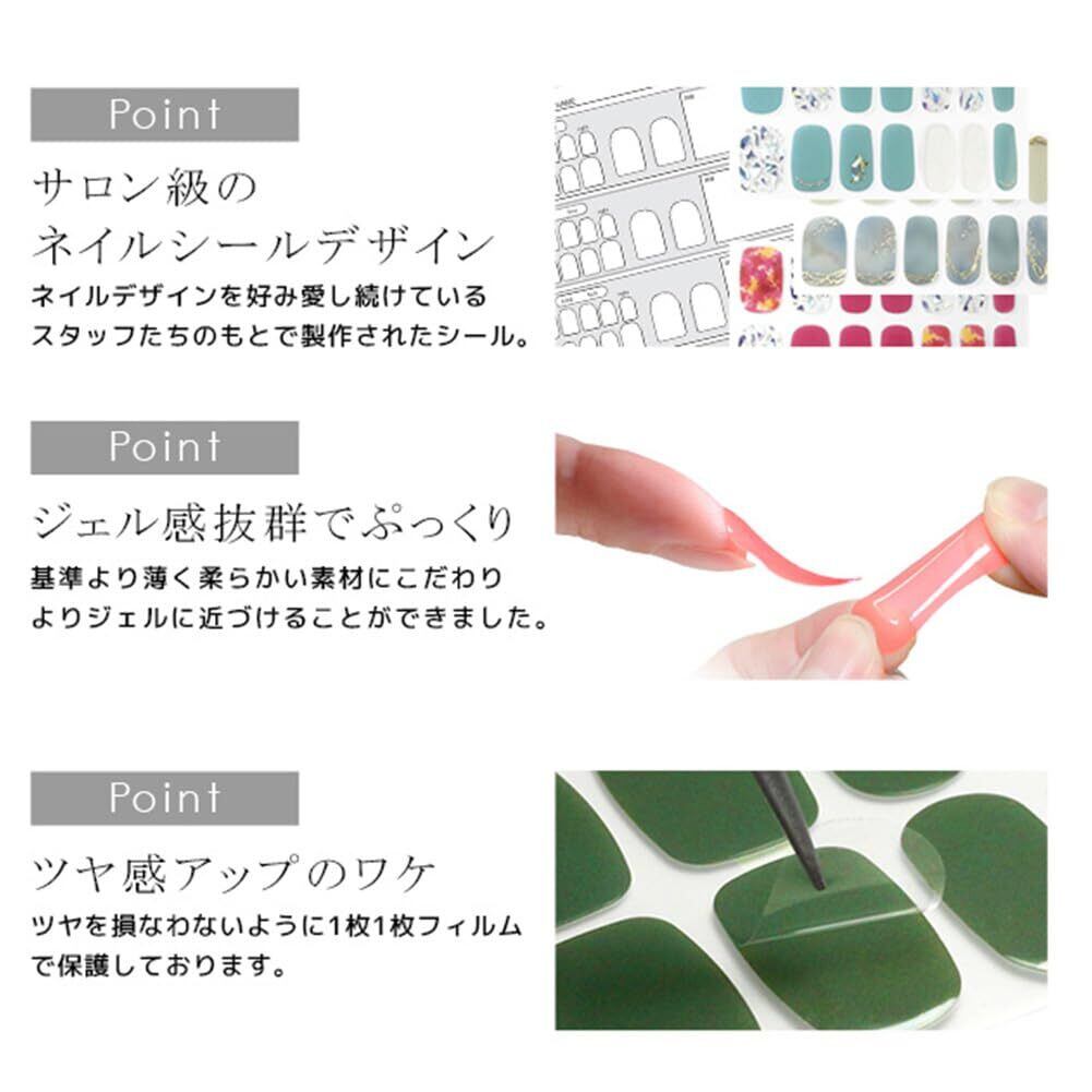 シールが擦れることでぷるんとしたツヤを損なわないよう1枚1枚フィルムで保護されている為、届いてすぐ塗りたてのジェルネイルのツヤを楽しめます
