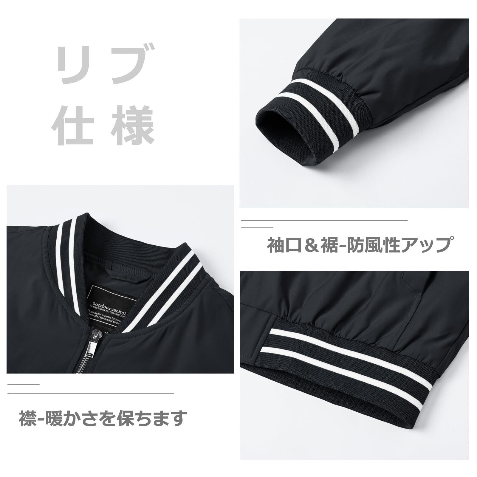 【デザイン】①袖口・襟・裾にはリブ素材を採用、伸縮性があり、動きやすい。そして、冷たい空気の侵入を防ぎ、全面的に体の暖かさを保ちます。②両サイドとインナーには、計3つのシンプルなポケットを装備。基本的な収納力に満足。