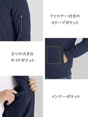 2.設計:①サイドには、定番のポケットとジッパーポケット、2つの種類があります。②襟・袖口・裾リブ仕様なので、フィット性・動きやすさと、適度な防風保温性を高めています。③サイドポケット2つと左袖のポケット1つとインナーポケット*1の計4つのポケットが付いています。基本的な収納は十分です。両手を解放。④2つの左袖ペン差し付き。袖の取り出しやすい位置にあり、出し入れもスムーズ。⑤高級感のあるスタイリッシュで簡単なデザイン&スリムなシルエットが圧倒的にかっこいい。