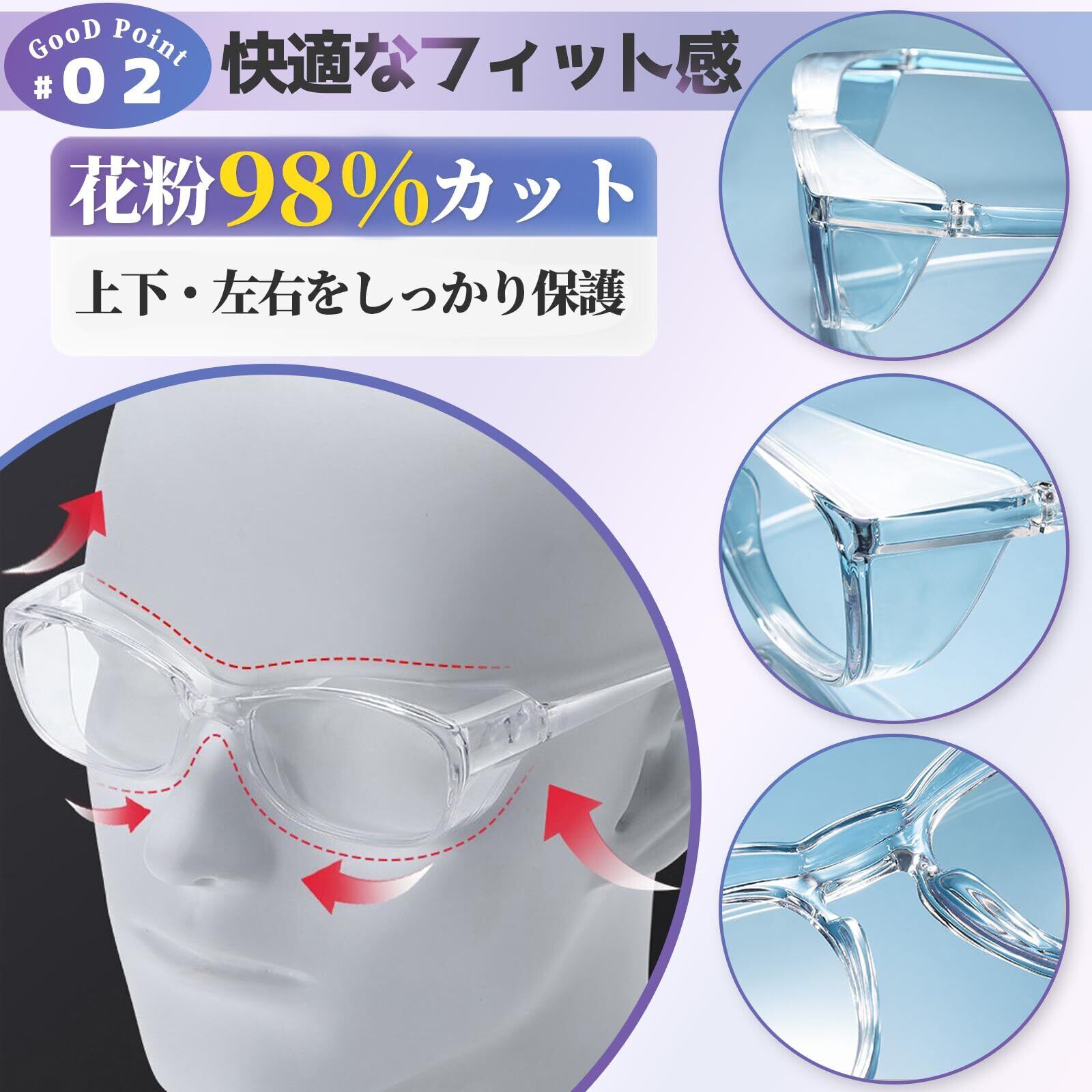 【 曇らない設計で視界良好! 】特殊な曇り止めコーティングを施しているため、温度差による曇りを防ぎ、クリアな視界をキープ。花粉だけでなく、風やほこりからも目を保護し、トータルで安心の視界を提供します。