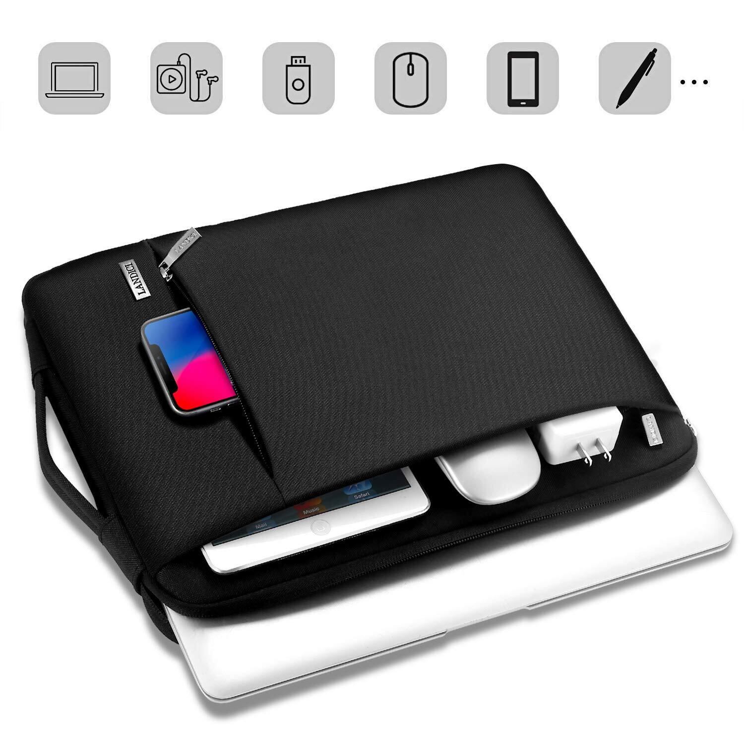 LANDICI 360°保護 パソコンケース 13 14インチ pcケース 衝撃吸収防水 ノートパソコン ケース 13.3/13.6 MacBook Air M4/M3/M2/M1 2025-2018、MacBook Pro 13/14、Surface Laptop 5-1世代/Studio 2021/Book 3/2/1、Dell、ASUSに対応 13-14型ノートpcケース 手提付き,ブラック