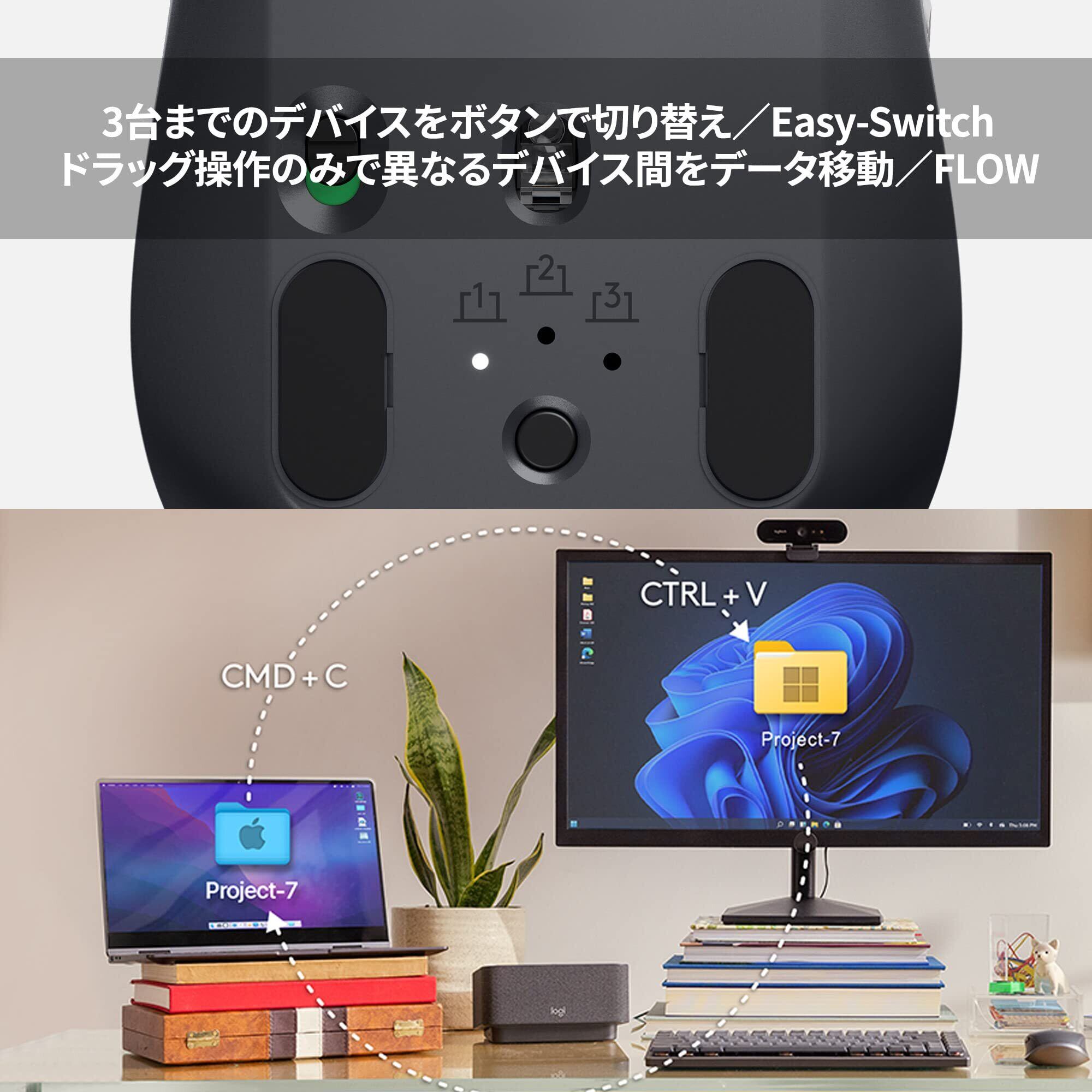 超高速スクロールホイールを搭載したMXシリーズの持ち運びやすいスタイリッシュな高機能ワイヤレスマウスが静音モデル&8000dpiの高トラッキング精度にパワーアップして登場! 従来モデルの魅力はそのままに高い静音性と高精度なトラッキングを実現したこのモデルはLogi Options+(※1)に新しく搭載したロジクール初となるマクロ登録機能「Smart Actions」(※2)に対応し、 複雑なマウスやキー操作のショートカットやファンクションをひとつのボタンに割り当てて登録が可能。作業効率を大幅アップします。 たとえば、データ入力作業や複数ソフトを起動して作業する時などよく使う複数のキーを押す必要がある場合に、この機能を使えば一つのボタンで実行できるため、作業効率が格段に上がります。 また、前モデル(MX Anywhere 3)と比較してクリック音がとても静かとなり、高い静音性を実現。あらゆる表面に対応できるダークフィールドセンサーは8000dpiと大幅に強化されており、ガラスなどの表面(※4)でも精確にトラッキングが可能。高精度のモニターにも対応しています。 さらに接続は従来のBluetooth&Unifying接続からBluetooth&Logi Bolt対応へとアップデート。 ロジクール独自のLogi Bolt接続ではデバイスをLogi Bolt USBレシーバー(※3)にペアリングすれば、ワイヤレスデバイスからの干渉の多い環境でも、堅固な接続を提供するように設計されており、中断を減少し、生産性を高めます。 連邦情報処理基準(FIPS)に準拠しながら脆弱性を軽減するように設計されており、ビジネスシーンでも安心してお使いいただけます。 1秒間に1000行のスクロールが可能な超高速かつ精確でさらに驚くほど静かなMagSpeed電磁気スクロールホイールを引き続き搭載。高速で回せばフリースピン(高速スクロール)に自動で切り替わり、長いドキュメントやワークシートの操作、スクロールが多いウェブサイトのブラウジングも素早く移動できます。 人間工学に基づいたコンパクトサイズながら手になじみやすい形状で、ボタンも直感的に操作できるように配置。本体重量は99gと軽量かつ薄型ながらも、長時間使用しても疲れにくく、全ての指を自然と置けるよう設計されています。 接続した3台までのデバイスを本体裏面のボタン1つで簡単に切り替えらえるロジクール独自のEasy-Switchとドラッグ操作のみで異なるデバイス間を流れるようにデータ移動できるFLOW機能(※5)対応。1回のフル充電で70日間の使用が可能なUSB-C-A充電式。1分の充電で3時間の使用が可能な急速充電にも対応しています。 本体のプラスチック部分には認定再生プラスチックが含まれ(グラファイトは78%、ペイルグレーは61%)、環境にも優しいモデルです。2年間のメーカー無償付。 対応OS:Windows 10, 11以降、macOS 11以降、Chrome OS、iPad OS 14以降、Android 9.0以降 (※1) Logi Options+は対応デバイスの操作アクションをカスタマイズできるロジクールの無料アプリケーションです。Logicoolホームページでダウンロードできます。 (※2) 「Smart Actions」の利用にはLogi Options+のダウンロードが必要です。最新版のLogi Options+をダウンロードをしてご利用ください。「Smart Actions」は「Logi Options+」に対応しているMXシリーズの全てのデバイスでご利用いただけます。Logi Options+はWindowsとMacのみに対応しています。 (※3) Logi Bolt USBレシーバーは別売となります。 (※4) 4mm以上の厚さが必要です。 (※5) FLOW機能はWindowsとMacのみに対応しています。