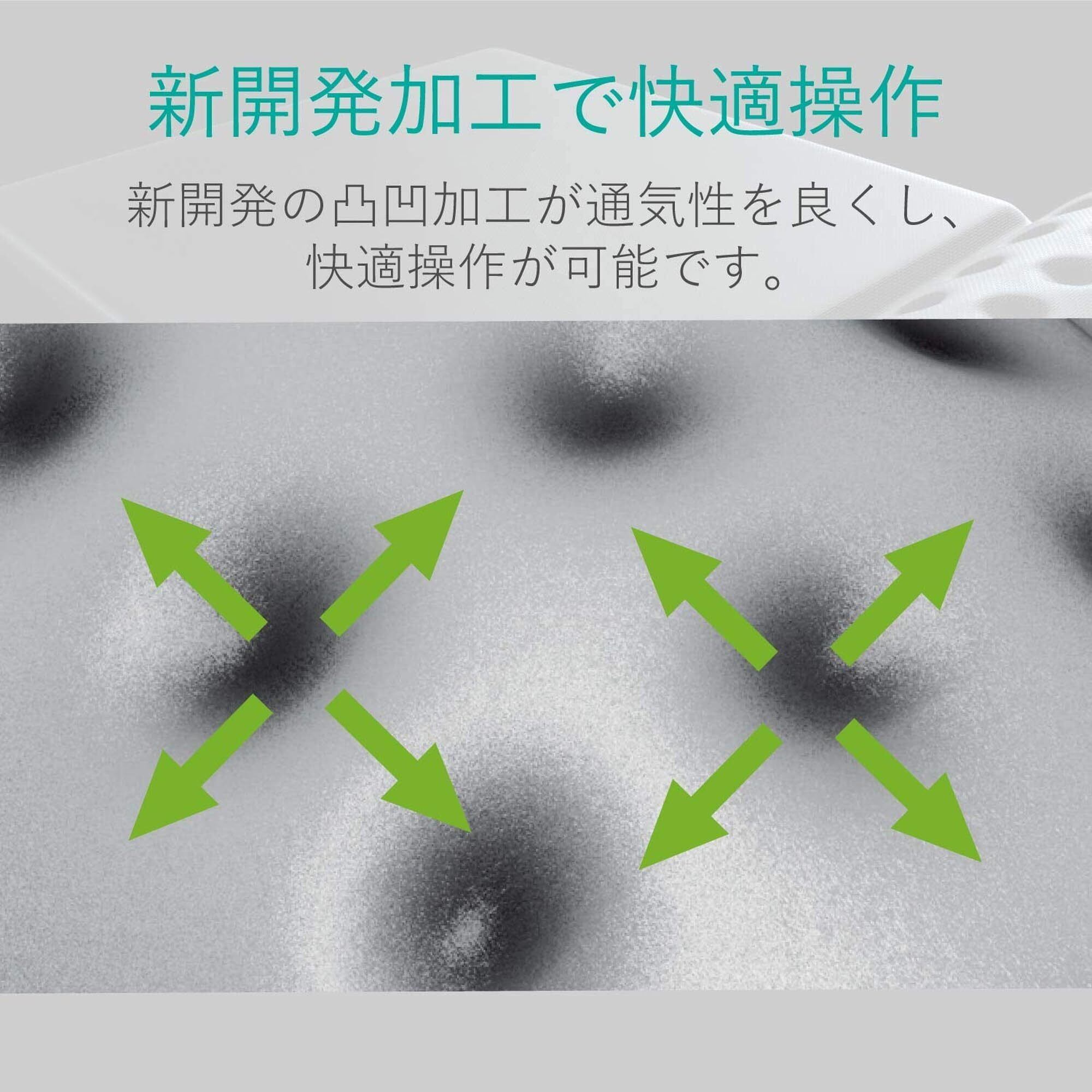 ●リストレスト部特徴1:反発弾性が非常に小さく、優れた衝撃吸収性能を持っています。圧力に対して復元速度が遅いため、優れた荷重分散性能を有しており、手首の形状にフィットし長時間のPC作業をサポートします。●リストレスト部特徴2:新開発の凹凸加工により心地よい感触と通気性を向上。より快適な使用感を実現しました。●マウス操作面:ソフトな操作面は、マウスが滑りすぎず静かな操作感が得られます。●裏面:デスクにピッタリと吸着してズレや移動を防ぎます。