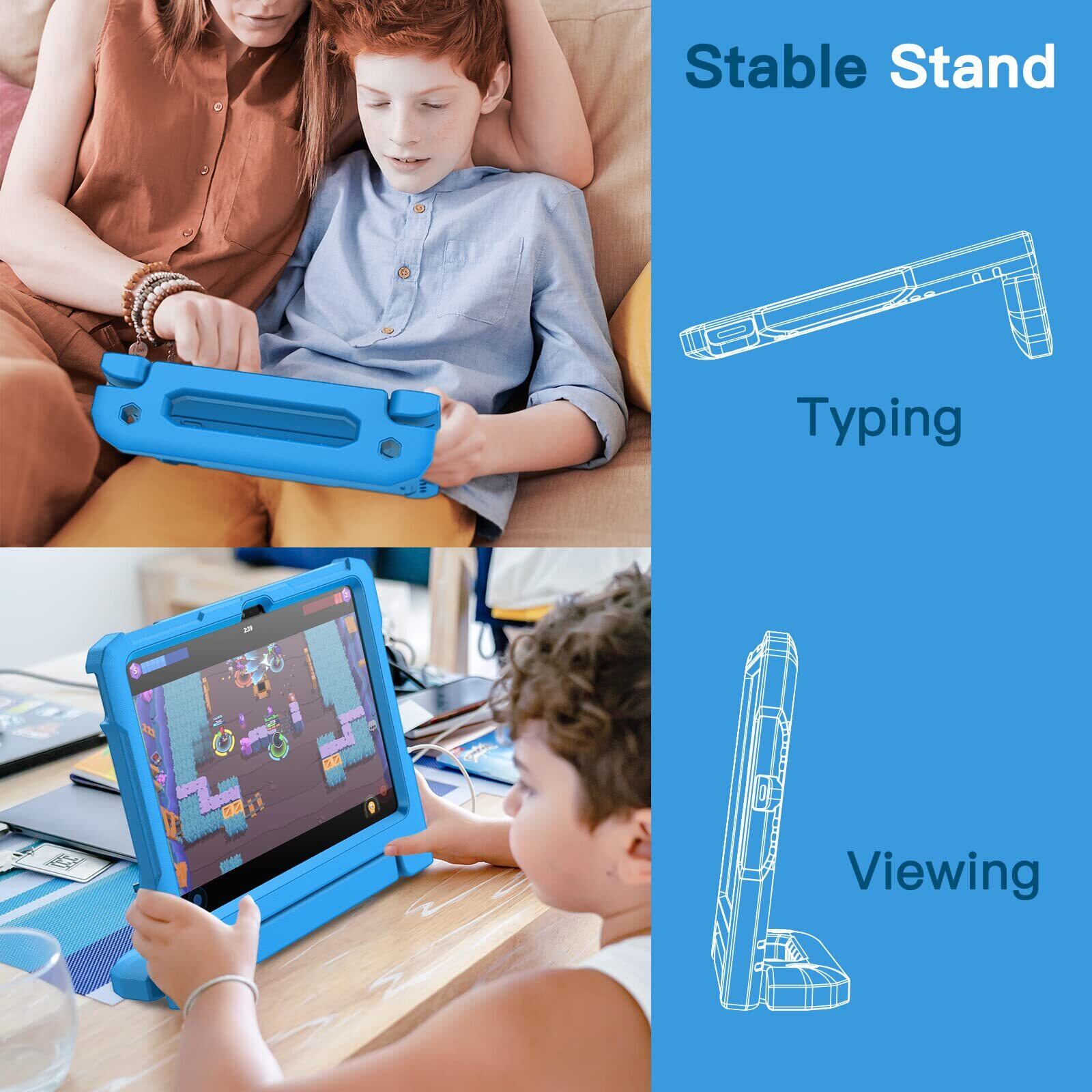 [多目的スタンド] 滑り止めの風合いで子供に優しいハンドルのデザインです。持ち�びやすいし、両手を解放して自由に視聴を体験するあるいは快適なタイピングのために折りたたんで、頑丈なスタンドに変えるのも易しいことです