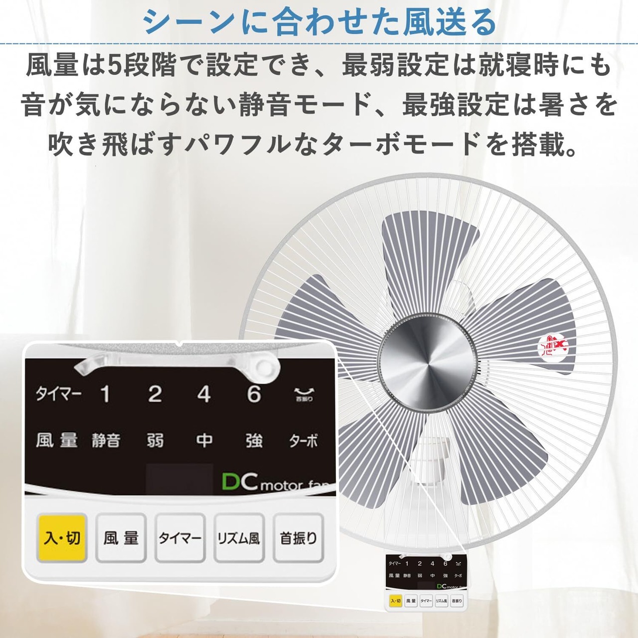 リモコン操作:運転ON/OFF、風量調節、首振りON/OFF(左右)、リズム風設定、タイマー設定(切・入)