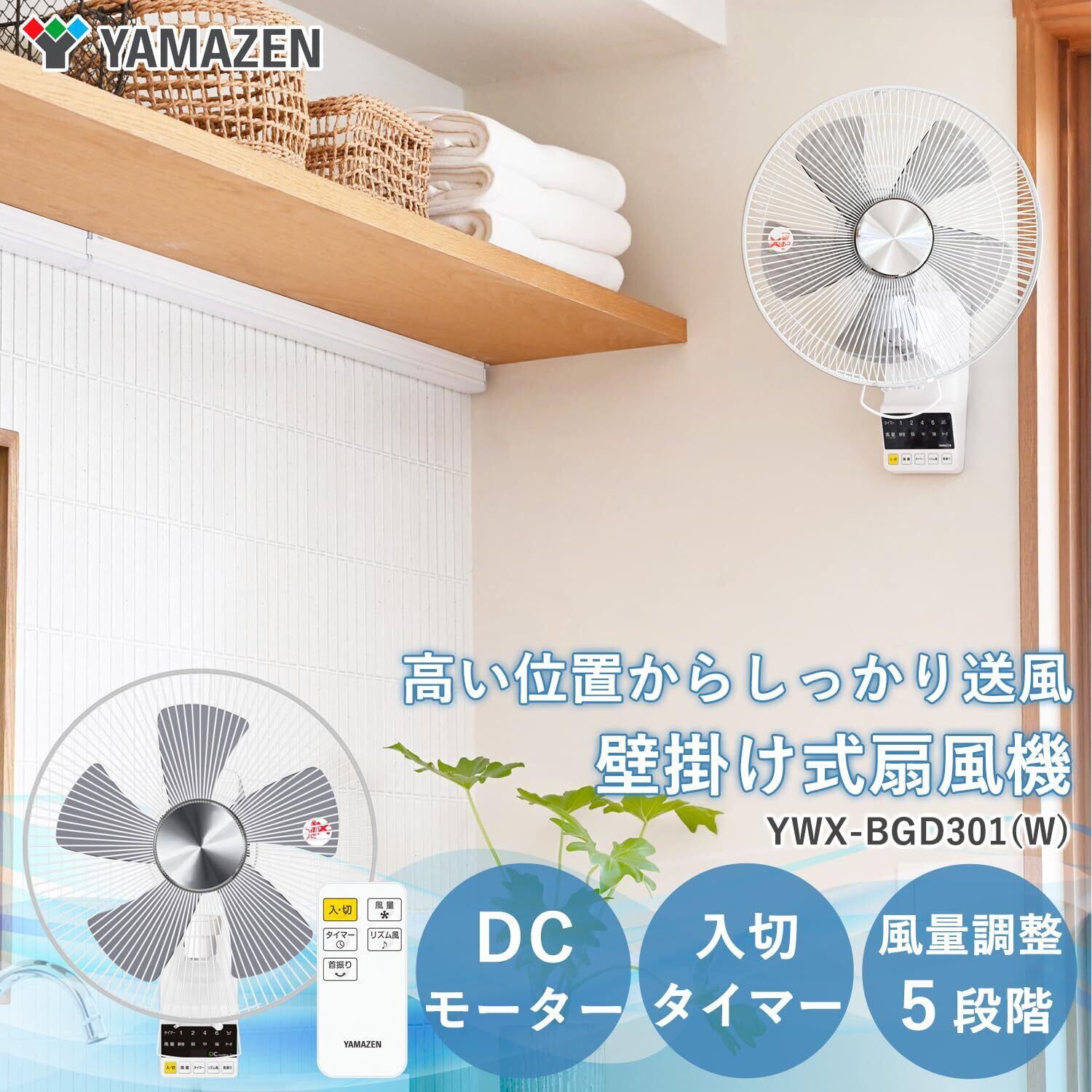 [山善] DCモーター搭載 30cm 壁掛扇風機 (静音モード搭載) (リモコン) (風量5段階) 換気 入切タイマー付 ホワイト YWX-BGD301(W)