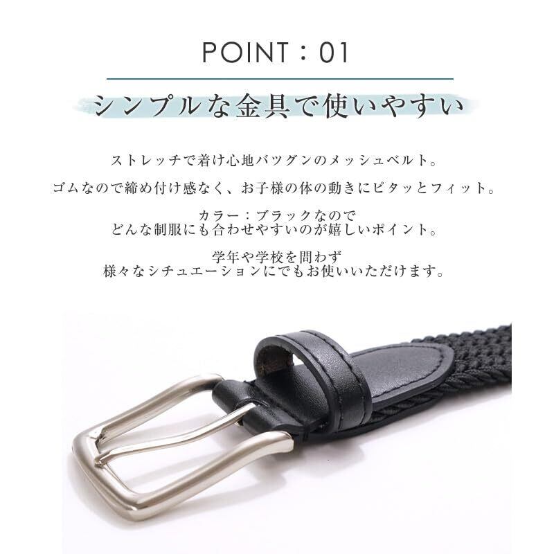 【伸縮ゴムメッシュベルト】ストレッチで着け心地バツグンのメッシュベルト。ゴムなので締め付け感なく、お子様の体の動きにピタッとフィット。太すぎず細すぎない帯幅なのでどの制服にも合わせやすいのがうれしいポイント。制服用、普段着用など、学年・学校を問わず様々なシチュエーションでお使い頂けます。