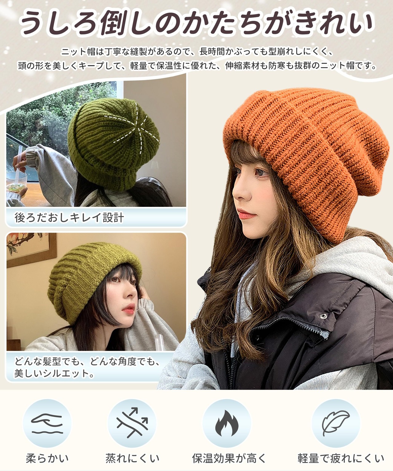 【定番型のニット帽・究極の防寒対策】超厚の毛糸編み生地で、縫製されたニット帽は、ふんわりと頭を包み込む軽い被り心地、肌にやさしいで伸縮性にも保温性にも優れ、ファッション感と保温性を両立した秋冬向きのニット帽子です。寒い日にニット帽を耳に引き寄せたり、頭や耳を保温するのに十分な暖かさを提供します。ふんわり肉厚な生地感で保温性に優れているので、お酒落なだけしゃなく防寒対策としてもかぶれる優秀ニット帽です!