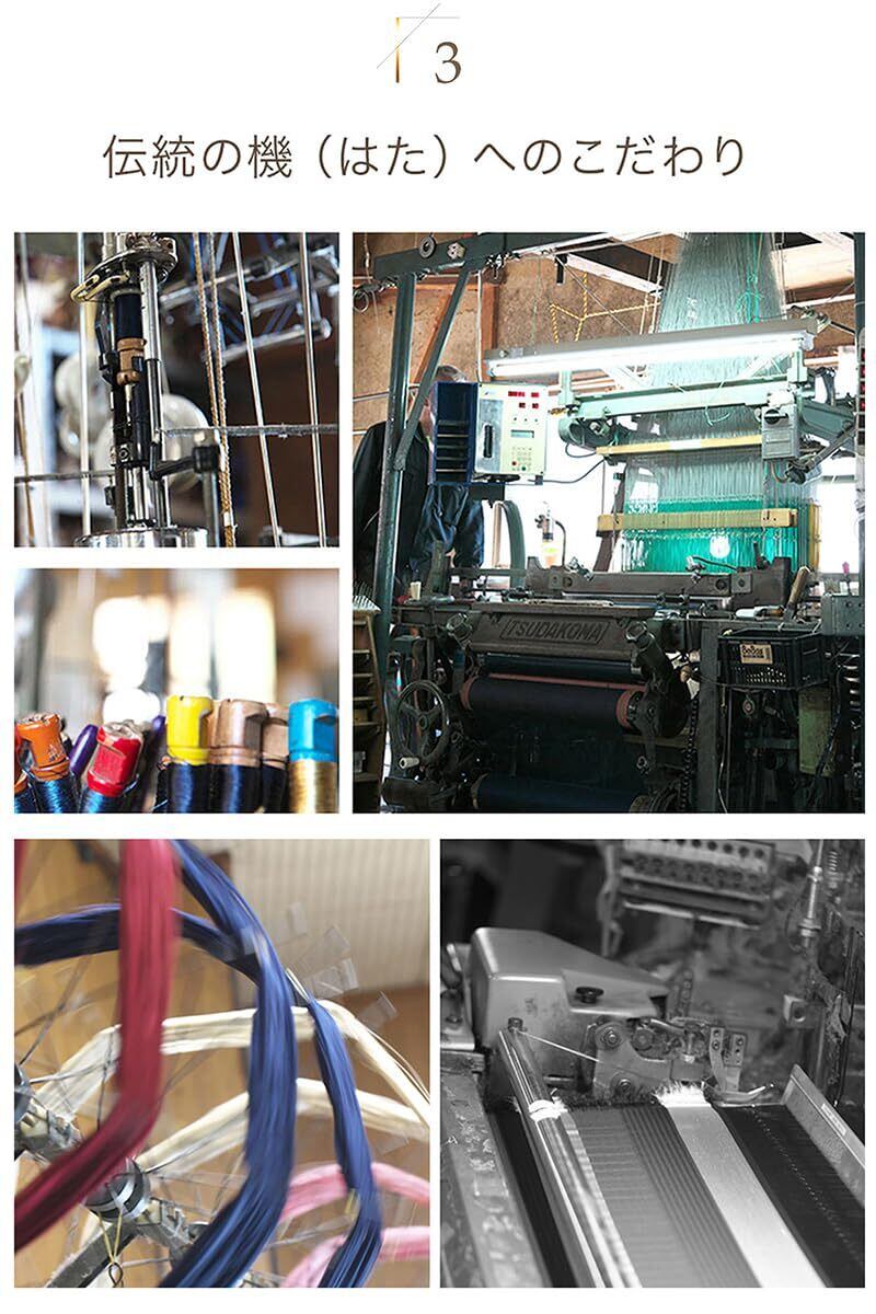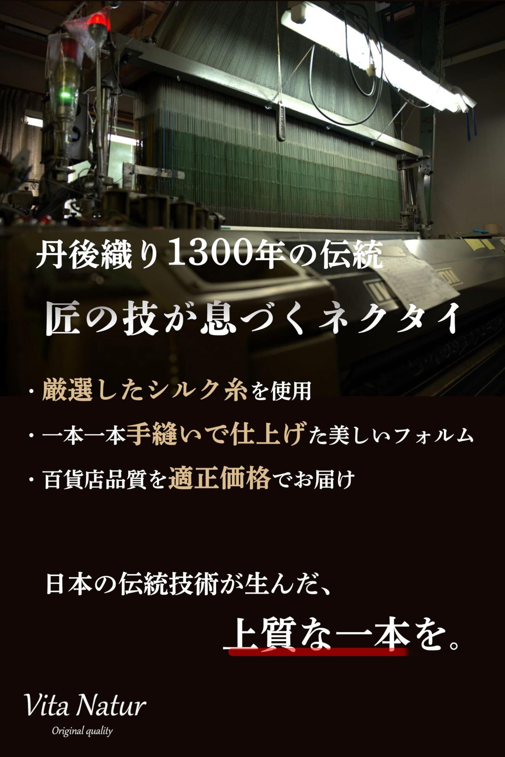 【ハンドメイド加工、伝統の機(はた)へのこだわり】Vita Naturの加工は全て京都の提携工場によるハンドメイド加工です。現在、リバー加工(機械縫い)もありますが、Vita Naturではこだわりの機・糸・整理加工の表現をするにはハンドメイド加工が最適と考えます。海外では大量生産のため、高速織機の使用がほとんどですが、丹後では1960年代に製造されたシャトル機・1990年代に生産されたレピア機を日々メンテナンスして現在も使用しています。どちらも低速で細い糸をゆっくり織ることでふっくらした生地のねくたいを生産できます。