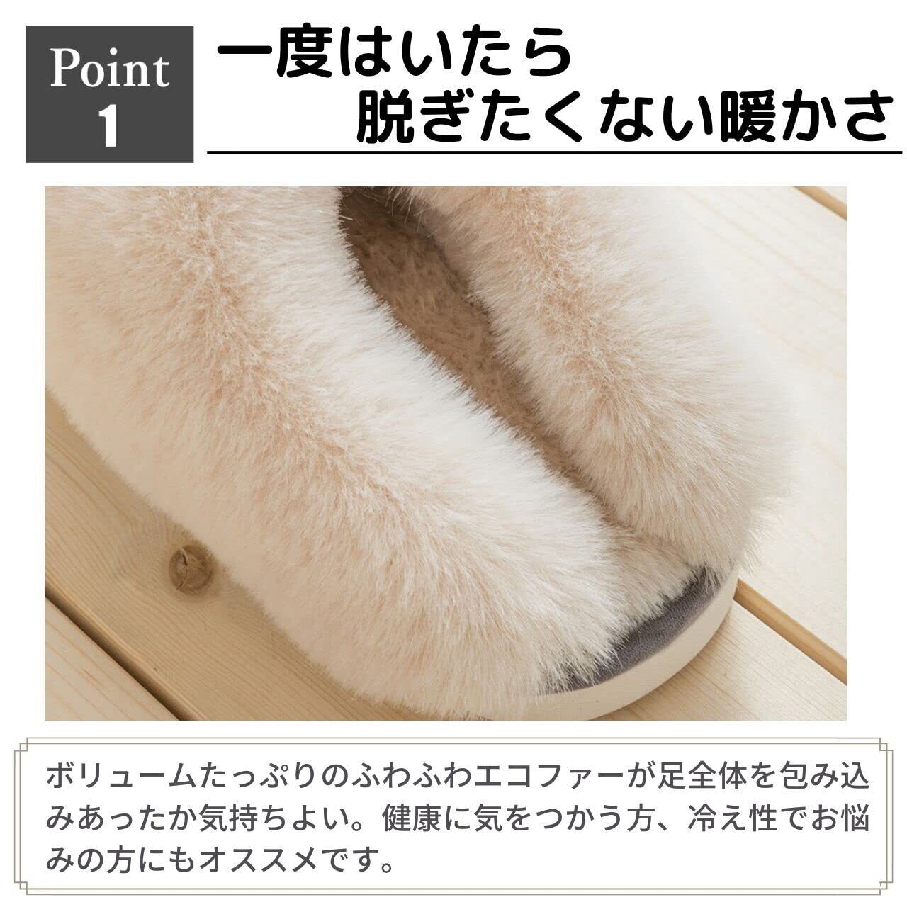 【脱ぎやすく、履きやすい】脱ぎやすさ・履きやすさを優先したかかとがない形ながらできるだけかかと側まで暖かくなるようにもこもこの毛が覆うようにしたデザイン。脱ぎやすさの形状と矛盾していますが、一度履いたら脱ぎたくなくなる暖かさ・気持ちよさのもこもこの毛が足を覆います。脱ぎ履きしやすいので、来客用にも最適です。