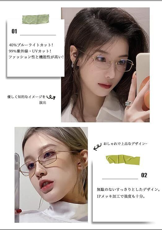 おしゃれ 伊達メガネ : 伊達メガネは、職人がこだわってデザインした無駄のない美しいフレームで、ファッションにしっくりとなじみ、IPメッキ処理を施すことで質感を高めるとともに、高い耐久性も実現している。さらに、小さめのウェリントン型と金属製の細身のフレームを組み合わせて知的なイメージを演出。