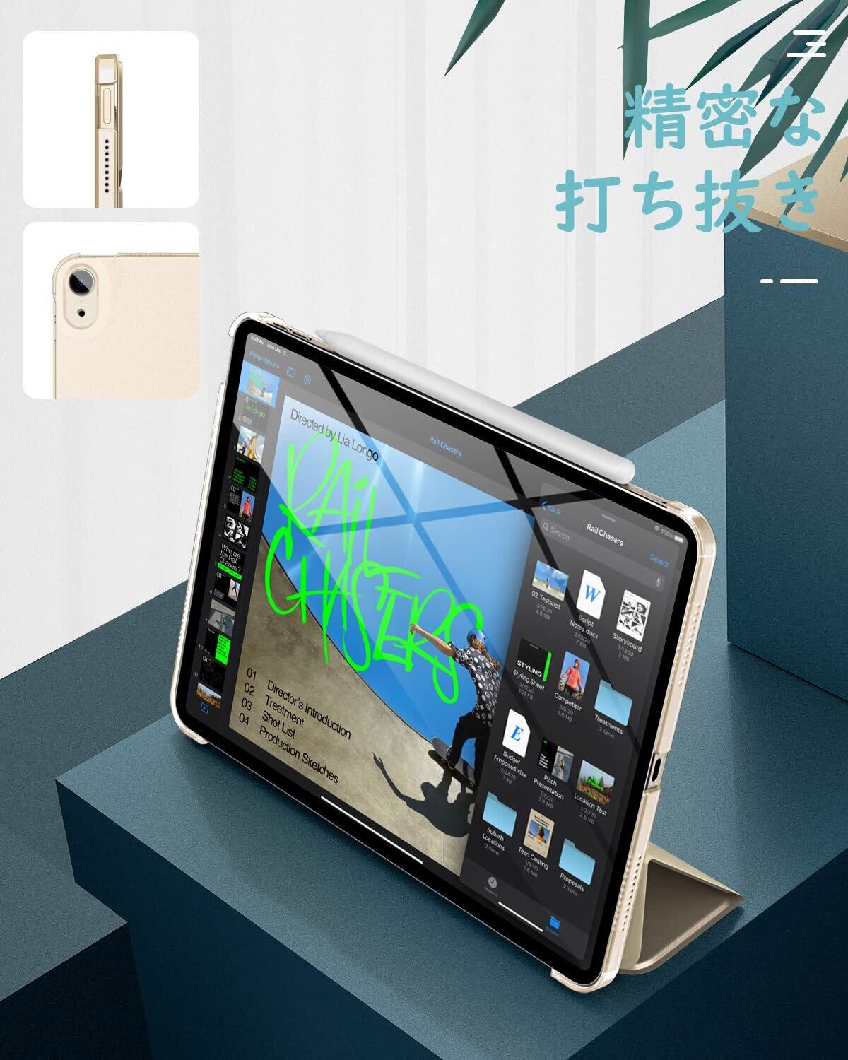 「ぴったり着装」 専用設計された全面保護ケースとなっているため、ケースを装着したまま電源ボタン、音量ボタン、写真を撮る、充電等すべての機能にアクセスできます。ApplePencil USB-C(iPad Air 11インチ用)の磁気吸着、Pencil Pro(iPad Air 11インチ用)及び ApplePencil第2世代(iPad Air 第5世代/第4世代 10.9インチ用)のワイヤレス充電に対応できます。