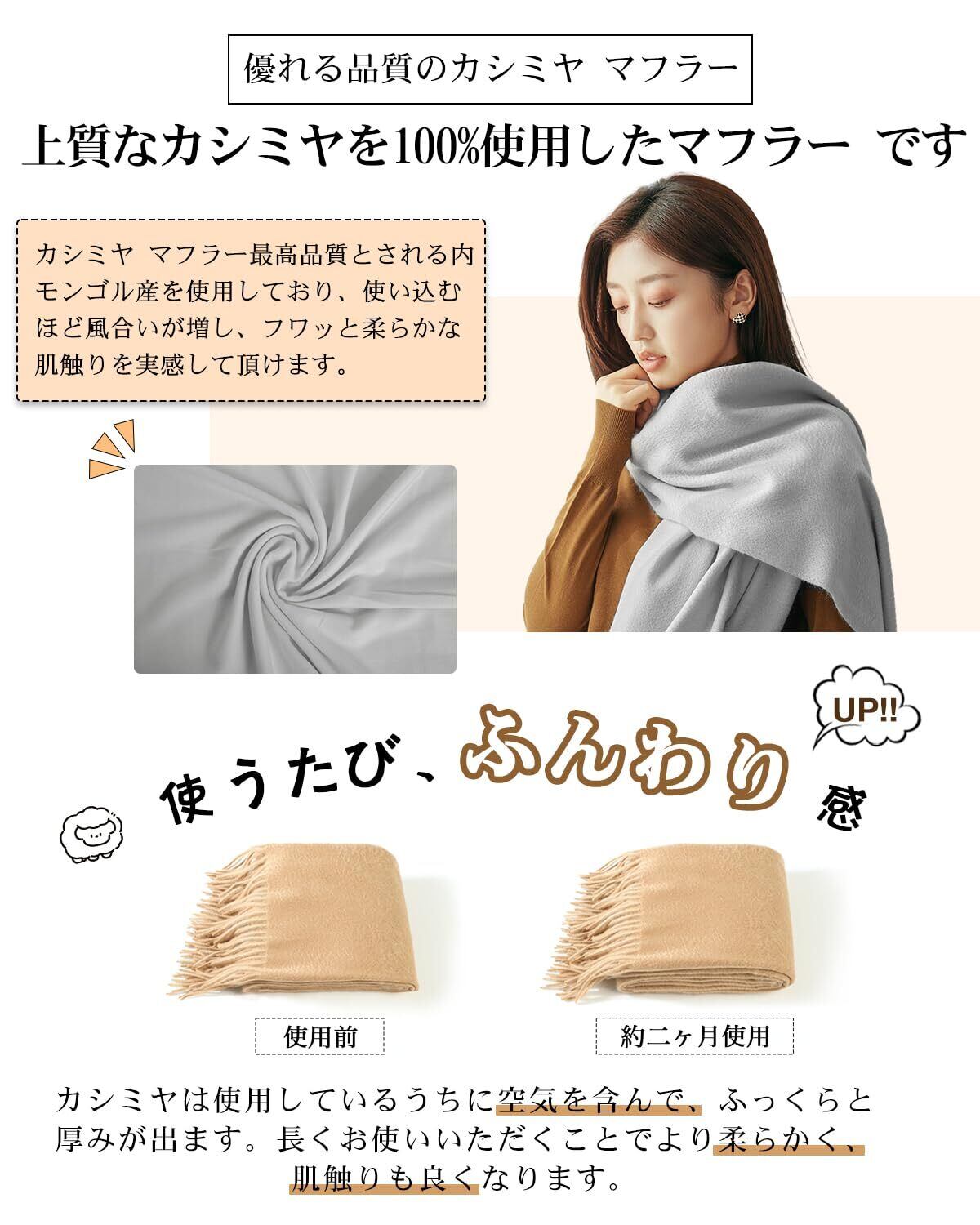 【優れる品質のカシミヤ マフラー】上質なカシミヤを100%使用したマフラー レディースです。カシミヤ マフラー最高品質とされる内モンゴル産を使用しており、使い込むほど風合いが増し、フワッと柔らかな肌触りを実感して頂けます。 また、日本での品質試験鑑定済です。 サイズ(全長)長さ約210cm×幅約70cm(フリンジ10cm × 2含む)。重量約310~約320g ※天然素材を使用しておりますので、サイズや重量に個体差が出る場合がございます。あらかじめご了承の上お買い求めください。