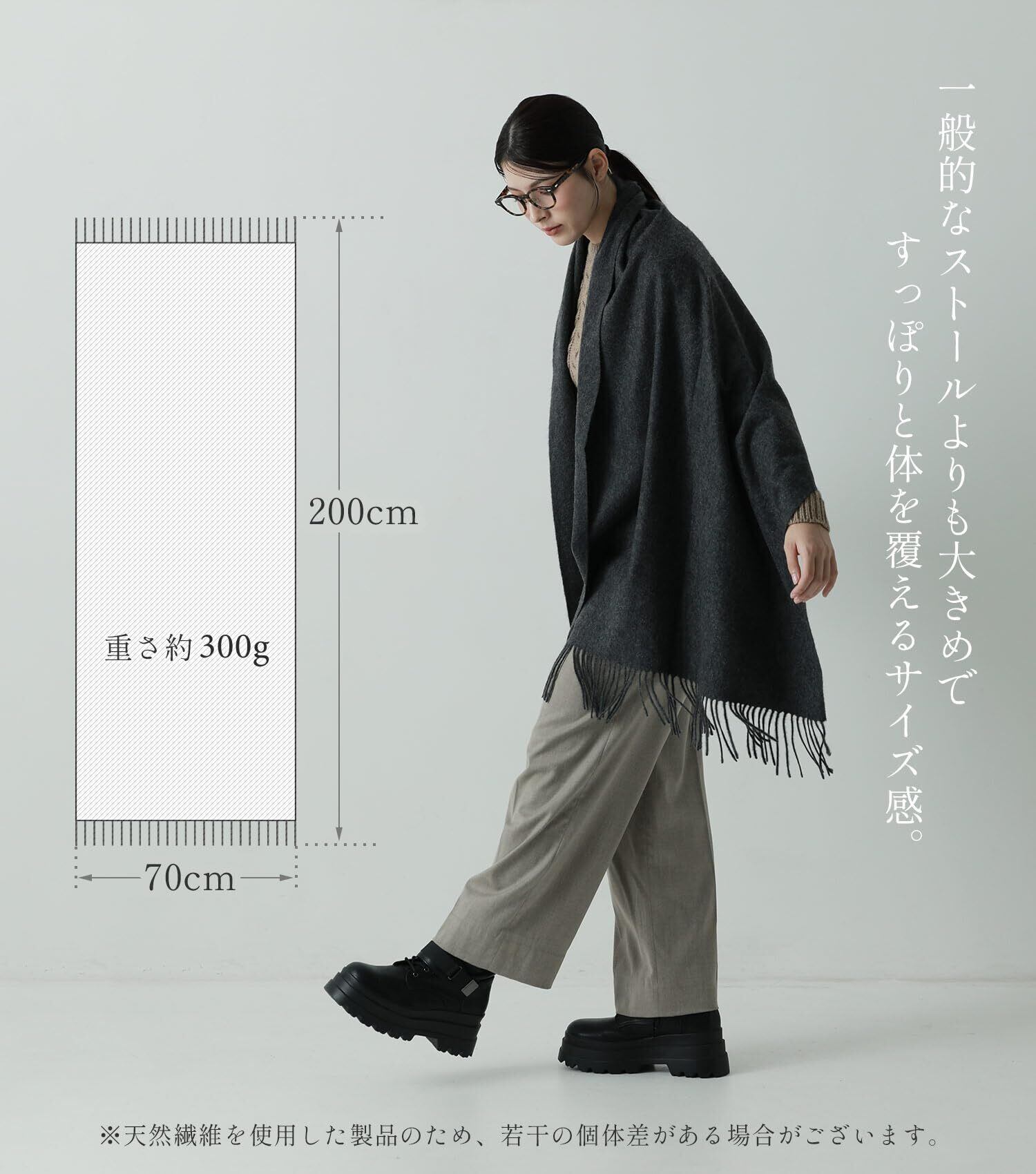 【様々なスタイルに合わせて】春先や秋にはサッと羽織るだけで使える大判サイズ。首元に巻くとボリュームたっぷりで小顔効果も。