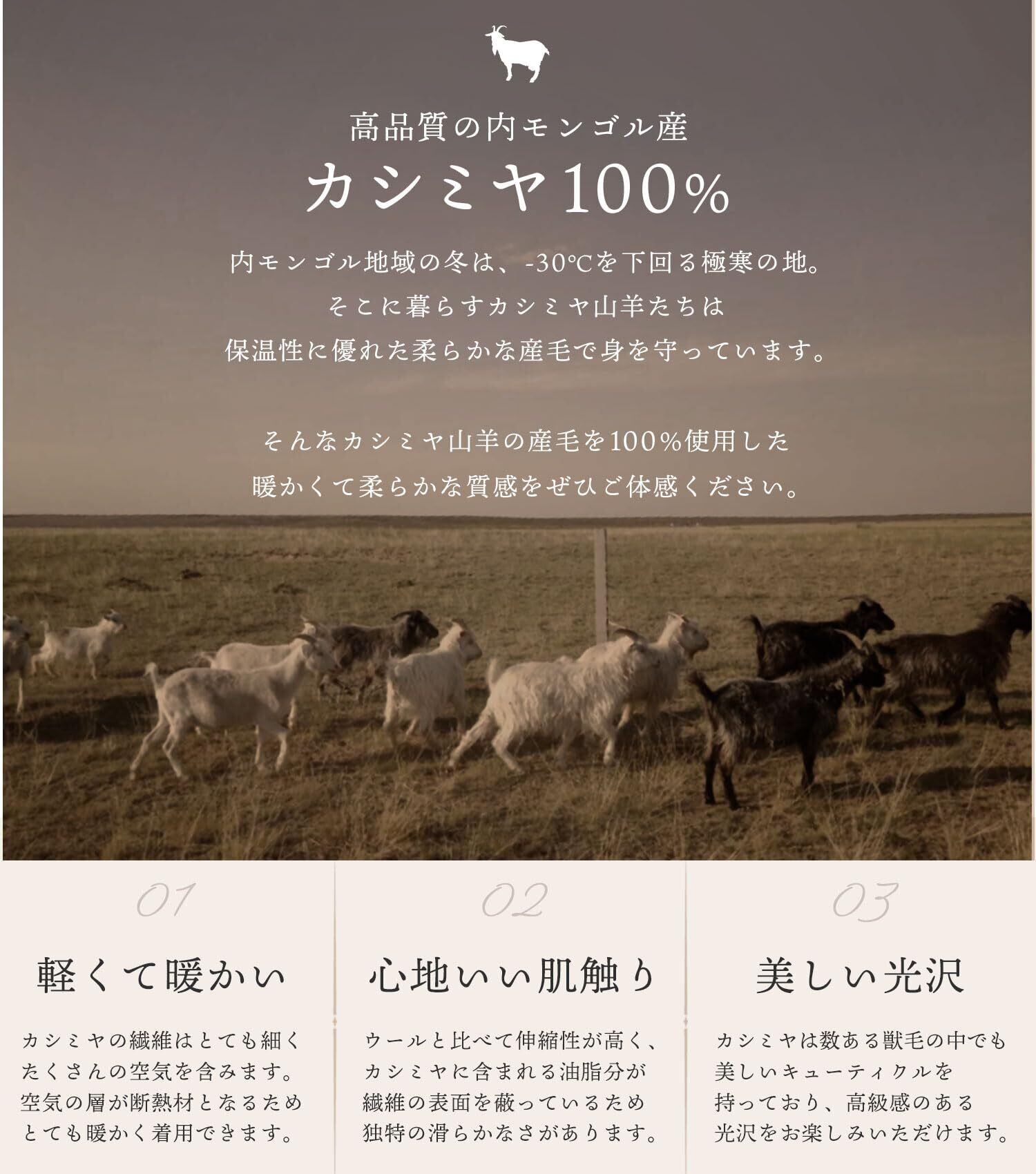 【繊維の宝石と呼ばれるカシミヤ】保温力に優れており、とても温かな素材です。カシミヤの中でも最高峰とされる内モンゴル産の毛を使っています。