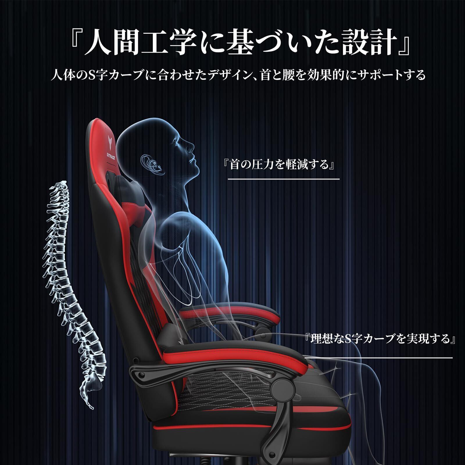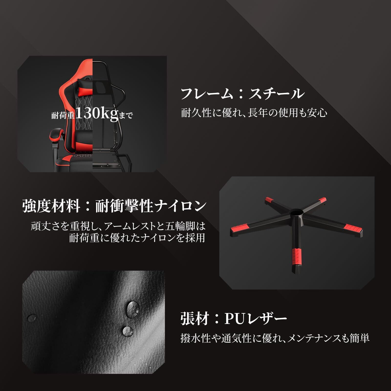 「人間工学設計&高品質素材を厳選」 ゲーミングチェアはS字形の人間工学構造設計を採用しており、首や腰のサポートを重点的に考慮しています。この設計により、体の自然なカーブに沿ったサポートを提供し、長時間座っていても快適さを実感できます。さらに、座面の形状や角度が適切に設計されており、姿勢をサポートし、腰への負担を軽減します。当社のゲーミングチェアは、高品質スポンジと通気性の良いレザー素材を使用しています。高品質スポンジは体にフィットし、長時間座っていても形状を保ちます。また、通気性の良いレザー素材は、暑い季節でも蒸れにくく、快適な座り心地を提供します。素材の品質にこだわることで、耐久性や快適性を追求しています。