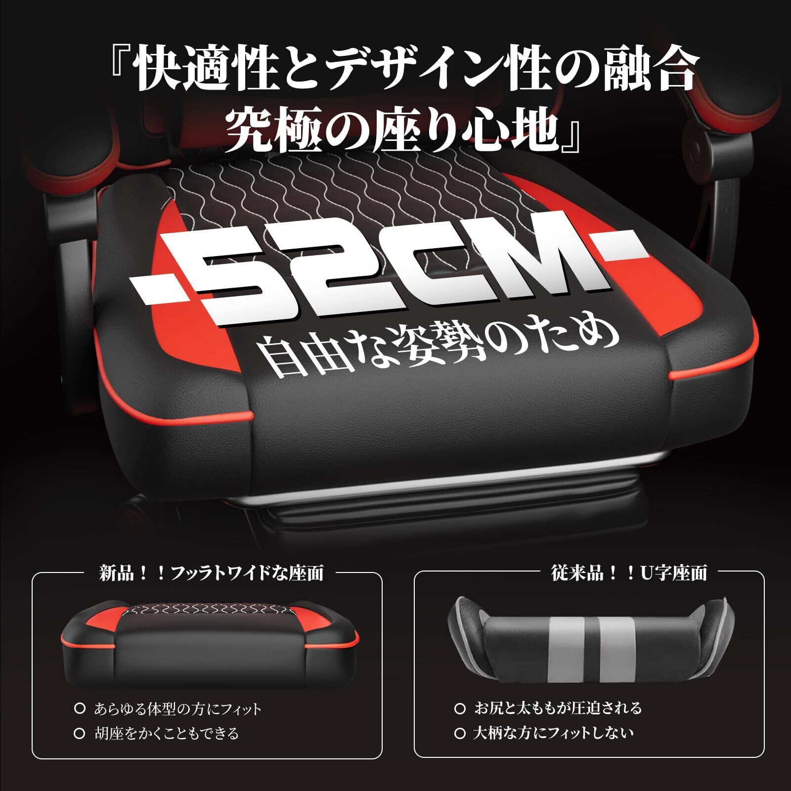 【広々とした平らな座面で快適な座り心地を実現】このゲーミングチェアは、座面の幅が52cmと少し大きめで、ゆとりある設計が特長です。伝統的なU字座面を改良し、両サイドを削って平らなデザインになっています。両足を広げても引っかからず、痛みを感じません。あらゆる体型の方にフィットします。体格の小さい方はそのまま座って胡座をかくこともでき、大柄な方はオットマンを利用して胡座をかくことも可能です。体重が均等に分散され、圧力が軽減されるため、疲労感が和らぎ、最も快適な座り心地をお楽しみいただけます。