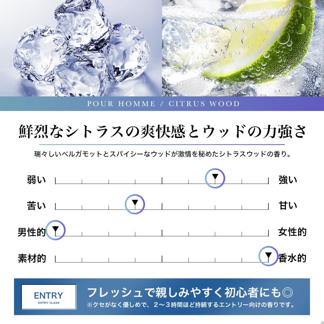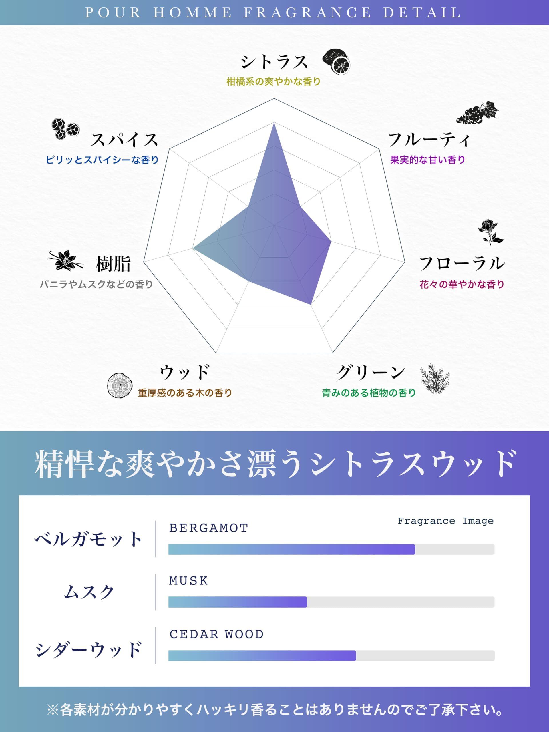 【心地よい持続力と魅力的なコンビネーション】この香水は、フレッシュなシトラスノートとウッドノートが絶妙にブレンドされています。香りは時間が経つにつれ深みを増し、あなたの個性や魅力を引き立てます。軽やかな香りから始まり、緩やかに変化していく香りの楽しみを、ぜひご体感ください。