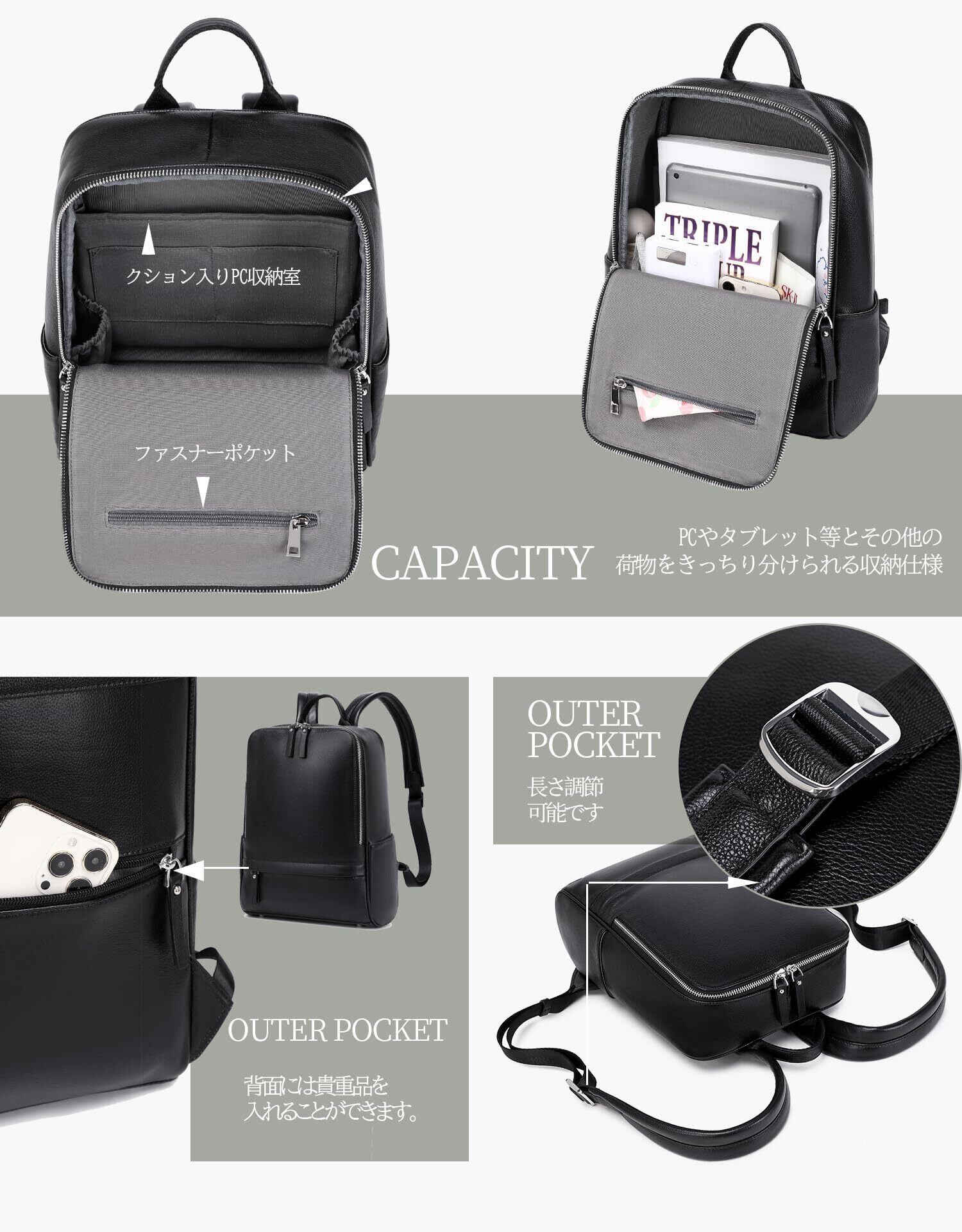 本体サイズ:縦33X横25 X奥行12cm( フェイレザータイプより一回り小さい) 大きすぎず小さすぎない、絶妙なサイズの本革リュックです。A4サイズや13インチPC収納可能ながら、マチが大きすぎずにコンパクトなのでスッキリとしたバッグとなっています。丸みのあるフォルムの開口部はファスナー仕様になっており、女性らしい柔らかなフォルムとA4サイズの収納スペースを確保できました。サイドペットボトルは縦に収納可能、内外にある整理ポケットが使い勝手抜群です。