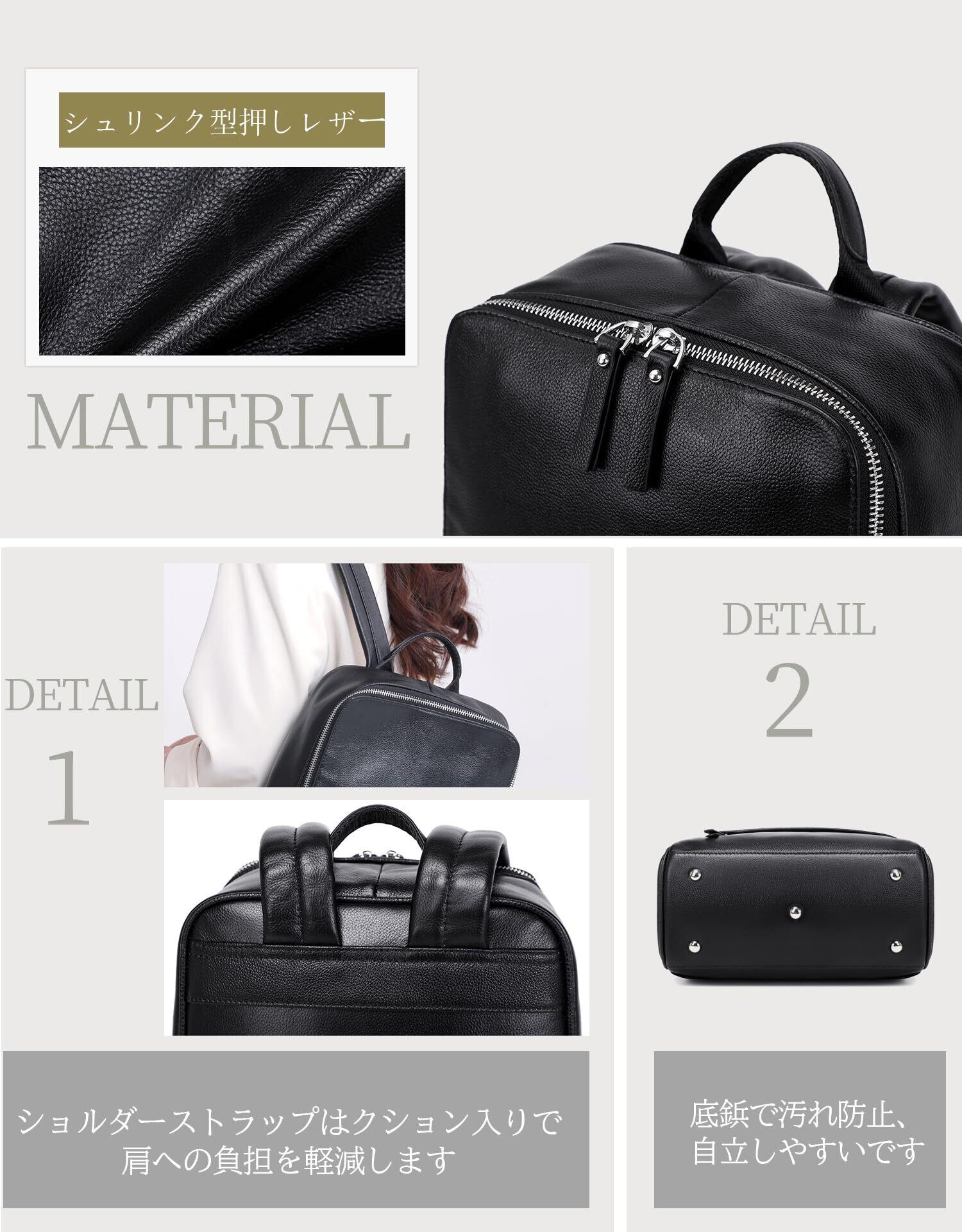 普通の革製リュックより軽量し、ショルダーベルトは牛革と綿ベルトを使用しています。背負い心地も快適になります。 梱包には万全を期しておりますが、運送の経過で商品にシワが出来る場合がございます。使用していくうちに生地が馴染んで、シワが消えていきますのでご安心ください。