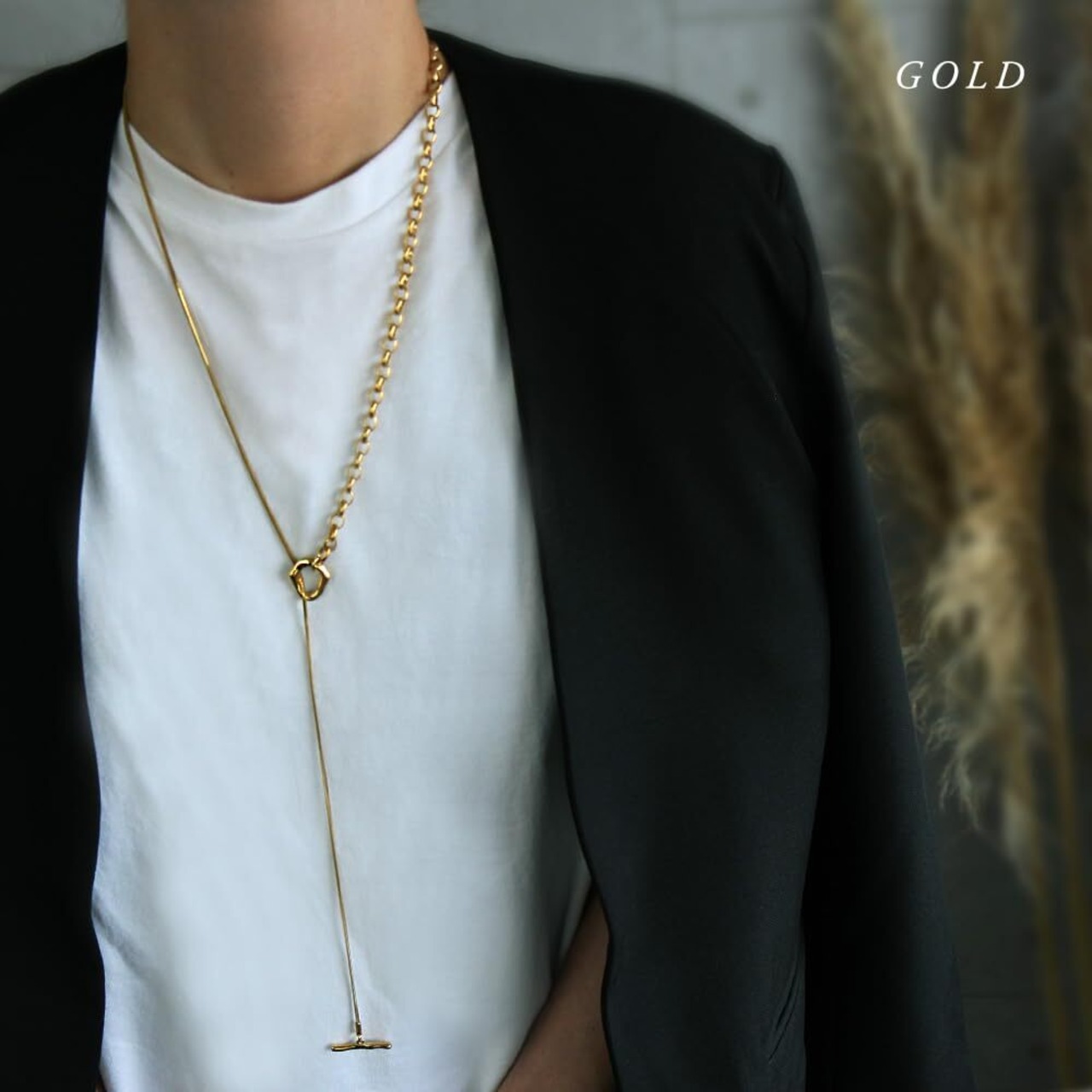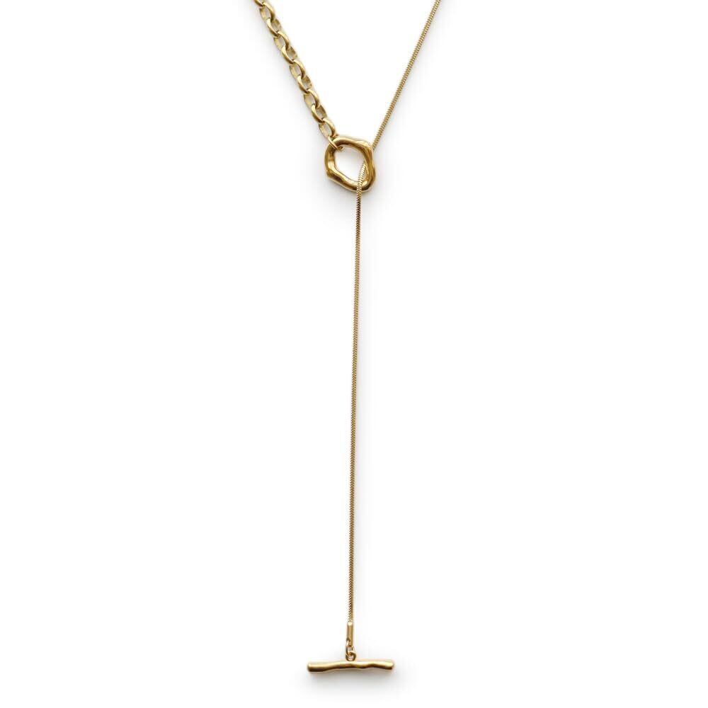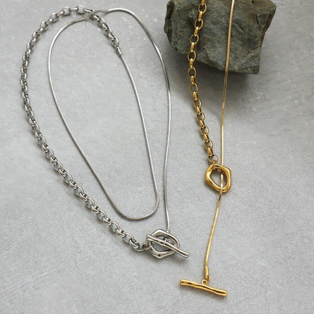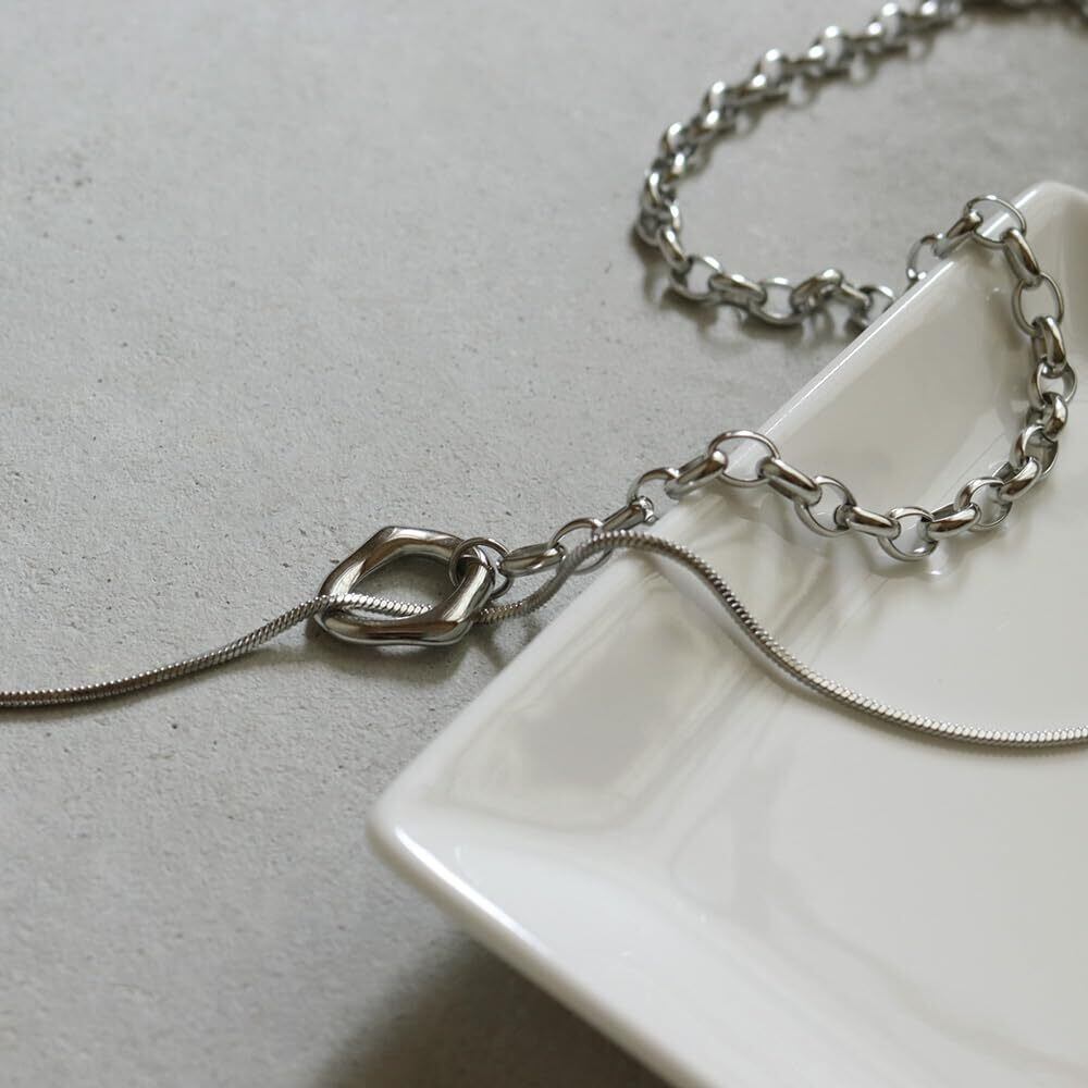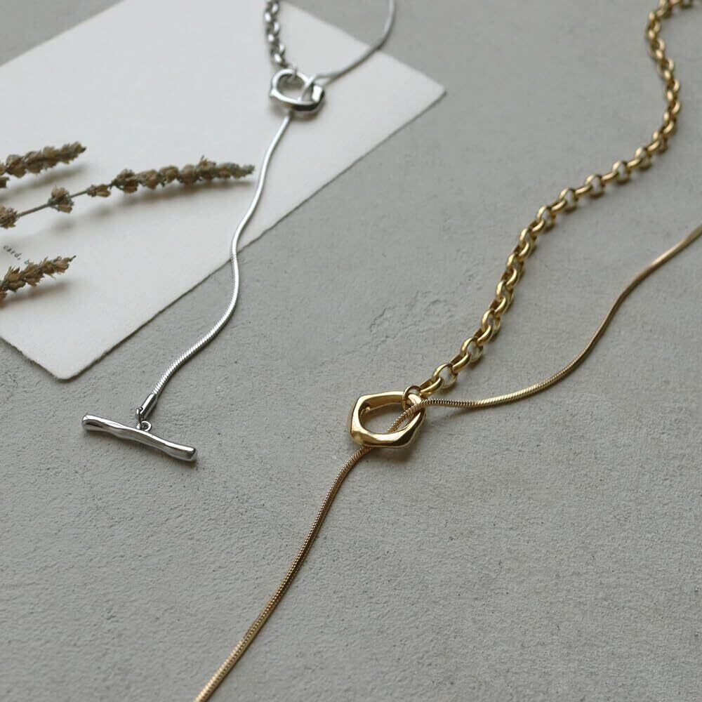 【ショートでもロングでも】メンズライクな中空チェーンとさらっと馴染みやすいスネークチェーンの2種類のチェーンを合わせたスタイリッシュなロングデザイン。 Y字の長さは固定されていないので、スタイルに合わせてアレンジが楽しめます。