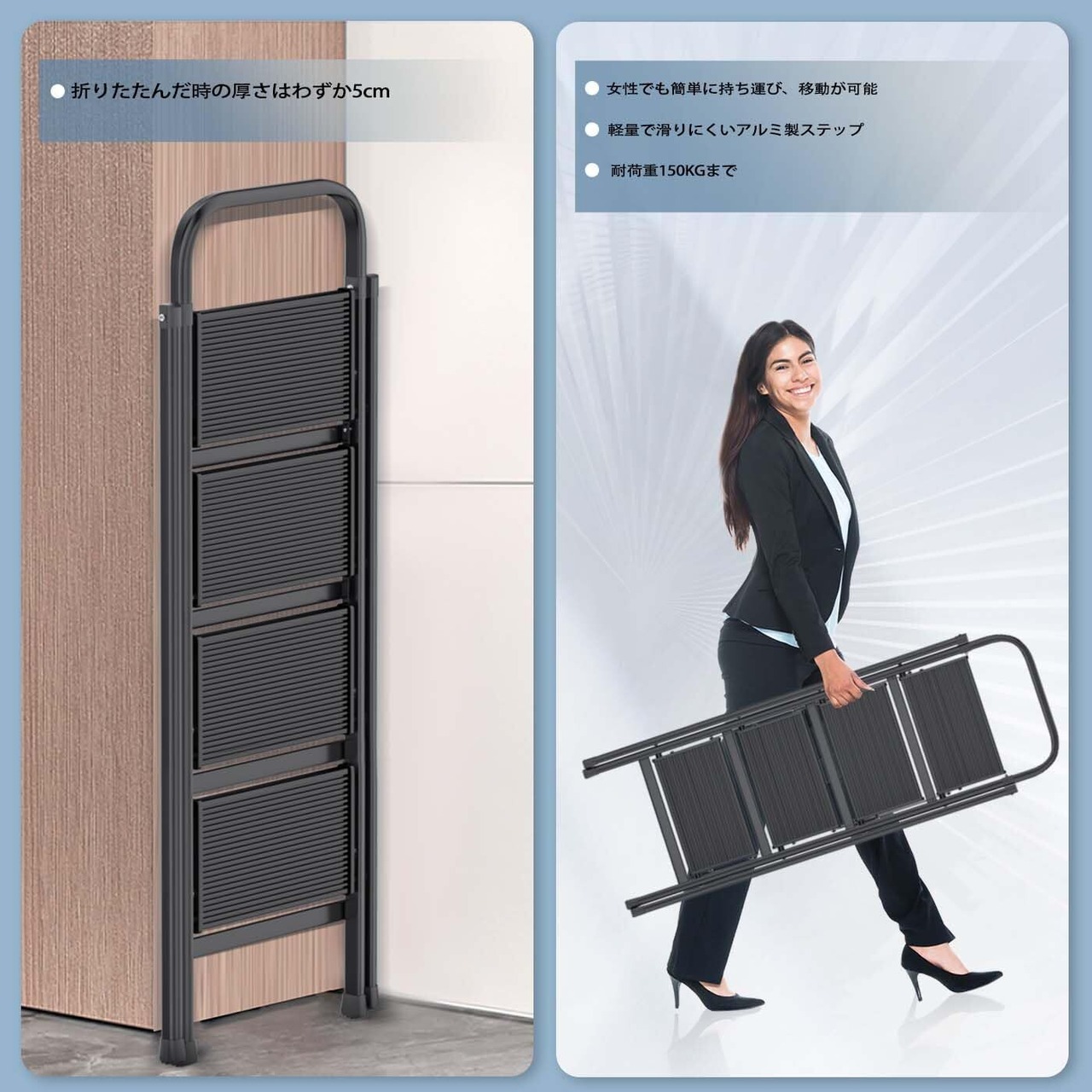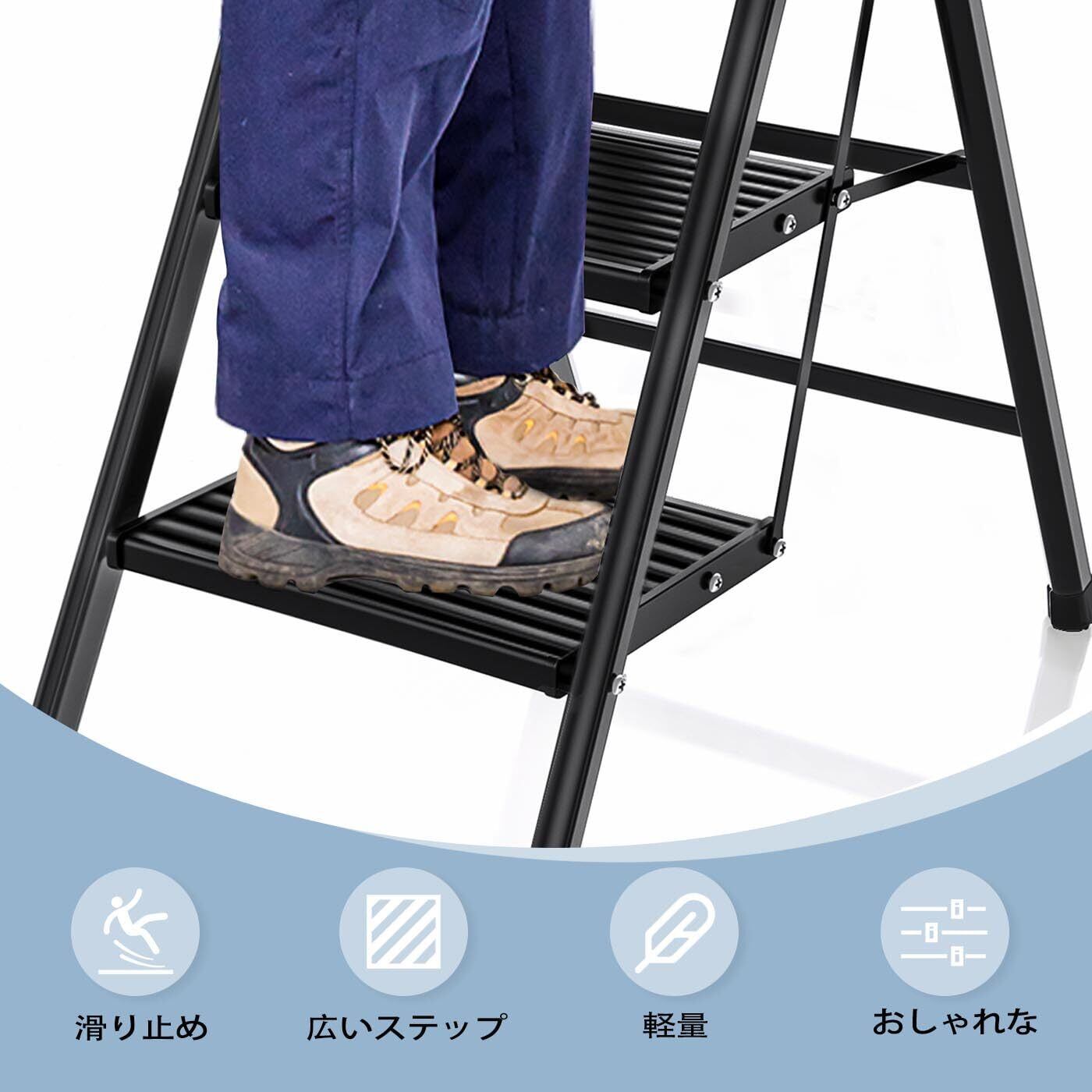 【安心の安全設計・安全性に配慮】手すり付きで、特に高いところでの作業時でも安心感があります。滑りにくい設計が施されており、しっかりと地面に接することで安全に使用できます。ご家庭や職場での安全対策に、一つあるととても便利です。
