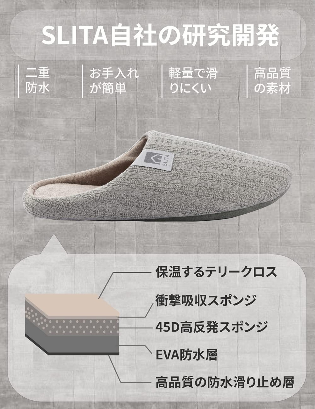 【快適な4層保護】:テリークロス保温層、45D高反発スポンジ層、EVA防水層と滑り止め静音層を採用することで、滑りの心配がなく、お手入れが簡単でルームシューズに最適!